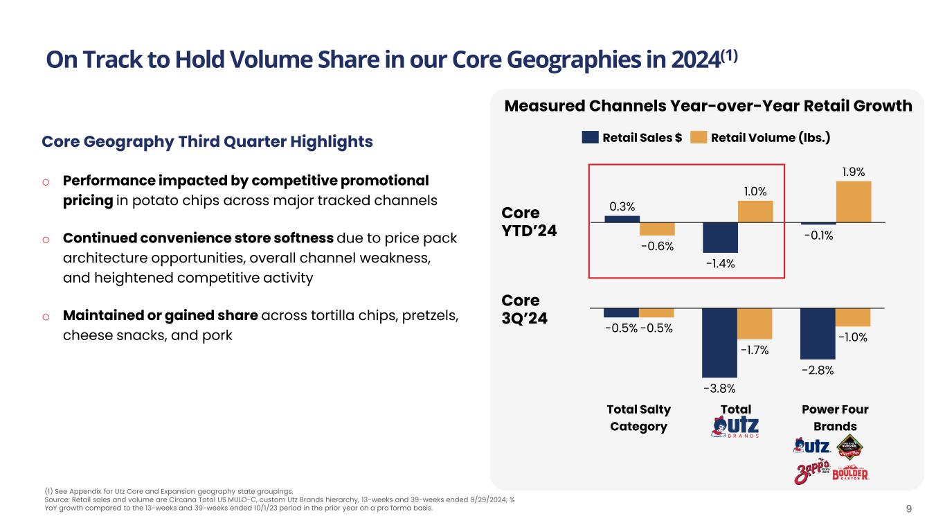 Retail Volume Share Gains in a More Promotional Environment 8 3Q’24 Measured Channels Year-over-Year Retail Growth (13-Weeks Ended 9/29/24) Source: Retail sales are Circana Total US MULO-C, custom Utz Brands hierarchy, 13-weeks ended 9/29/2024; % YoY growth compared to the 13-weeks ended 10/1/23 period in the prior year on a pro forma basis. (1) Represents Foundation Brands salty snack sales based on Circana Total MULO-C, custom Utz Brands hierarchy. This differs from internal total company volume results as it excludes Dips & Salsas, Private Label, Partner Brands and other small sales categories. o Organic Net Sales growth outpaced retail sales growth primarily due to strength in non-measured channels and stronger seasonal shipments vs. LY o Investments in geographic expansion and disciplined pricing strategy driving volume share gains led by our Power Four Brands o Retail sales trends impacted by a more competitive promotional environment in potato chips and softness in convenience store channel o Retail price per pound declined due to disciplined promotional pricing and convenience store channel weakness -0.2% 0.4% 0.3% 0.7% 0.7%Retail Volume (lbs.) Total Salty Category Total Power Brands Power Four Brands Foundation Brands -0.4% -1.3% -1.2% -0.6% -2.8% (1) Retail Sales $