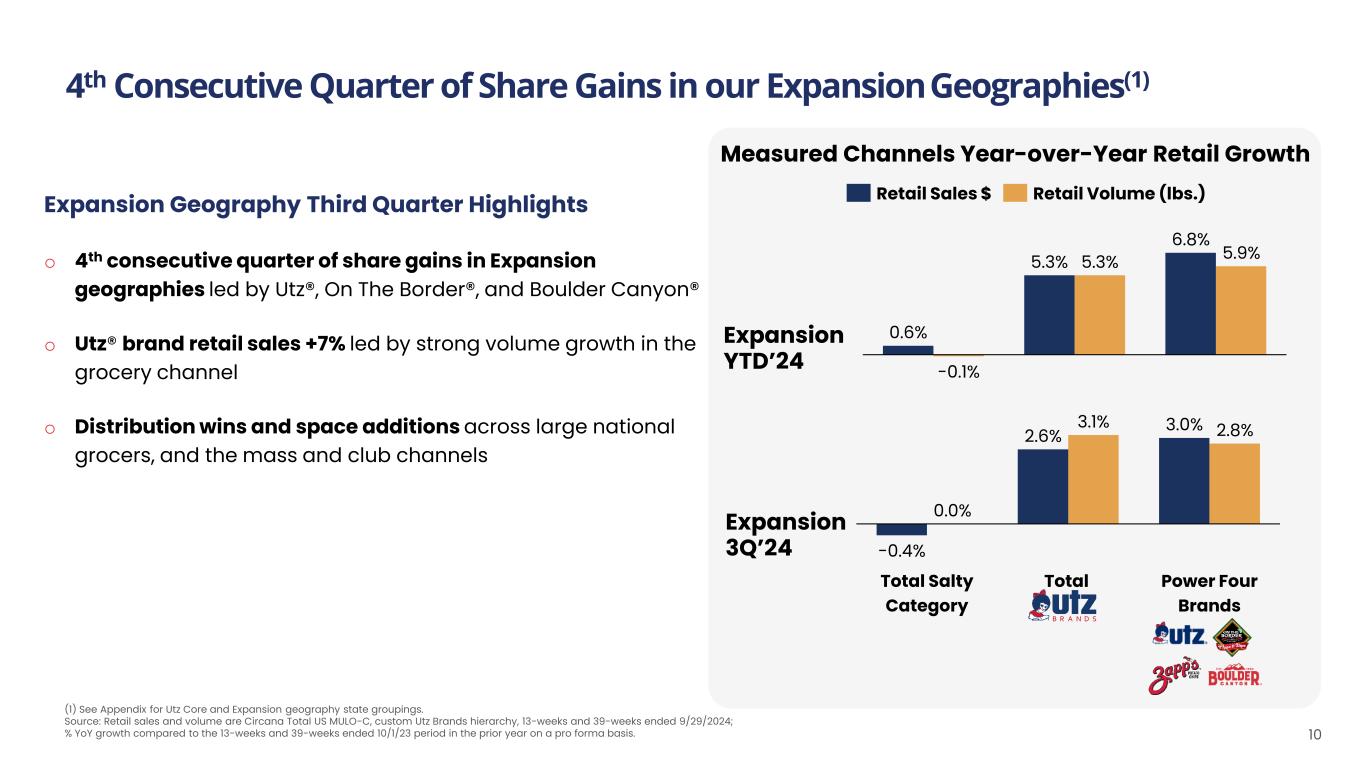 (1) See Appendix for Utz Core and Expansion geography state groupings. Source: Retail sales and volume are Circana Total US MULO-C, custom Utz Brands hierarchy, 13-weeks and 39-weeks ended 9/29/2024; % YoY growth compared to the 13-weeks and 39-weeks ended 10/1/23 period in the prior year on a pro forma basis. On Track to Hold Volume Share in our Core Geographies in 2024(1) 9 Measured Channels Year-over-Year Retail Growth Core YTD’24 Core 3Q’24 0.3% -0.6% -1.4% 1.0% -0.1% 1.9% Retail Sales $ Retail Volume (lbs.) Total Salty Category Total Power Four Brands -0.5% -0.5% -3.8% -1.7% -2.8% -1.0% Core Geography Third Quarter Highlights o Performance impacted by competitive promotional pricing in potato chips across major tracked channels o Continued convenience store softness due to price pack architecture opportunities, overall channel weakness, and heightened competitive activity o Maintained or gained share across tortilla chips, pretzels, cheese snacks, and pork