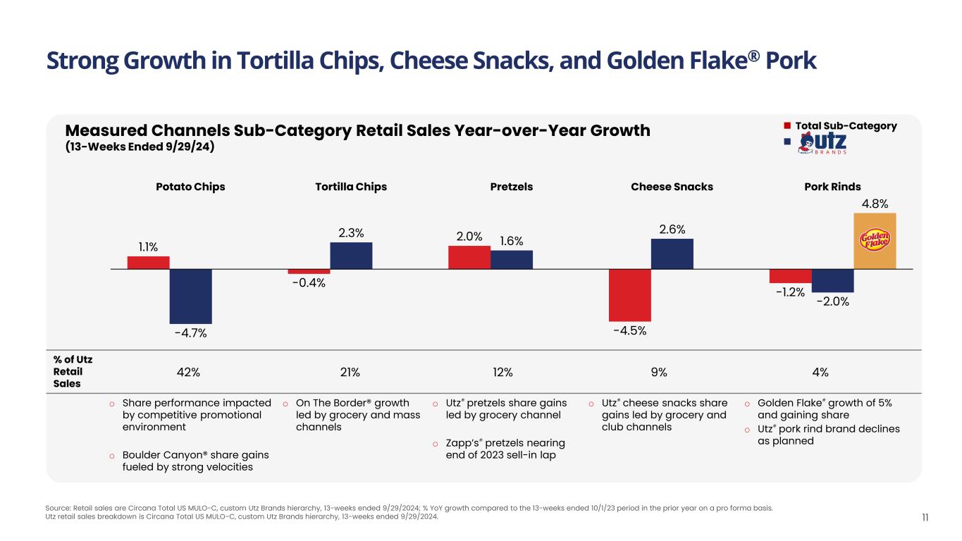 4th Consecutive Quarter of Share Gains in our ExpansionGeographies(1) 10 0.6% -0.1% 5.3% 5.3% 6.8% 5.9% Retail Sales $ Retail Volume (lbs.) -0.4% 0.0% 2.6% 3.1% 3.0% 2.8% Total Salty Category Total Power Four Brands Expansion Geography Third Quarter Highlights o 4th consecutive quarter of share gains in Expansion geographies led by Utz®, On The Border®, and Boulder Canyon® o Utz® brand retail sales +7% led by strong volume growth in the grocery channel o Distribution wins and space additions across large national grocers, and the mass and club channels Measured Channels Year-over-Year Retail Growth Expansion YTD’24 Expansion 3Q’24 (1) See Appendix for Utz Core and Expansion geography state groupings. Source: Retail sales and volume are Circana Total US MULO-C, custom Utz Brands hierarchy, 13-weeks and 39-weeks ended 9/29/2024; % YoY growth compared to the 13-weeks and 39-weeks ended 10/1/23 period in the prior year on a pro forma basis.