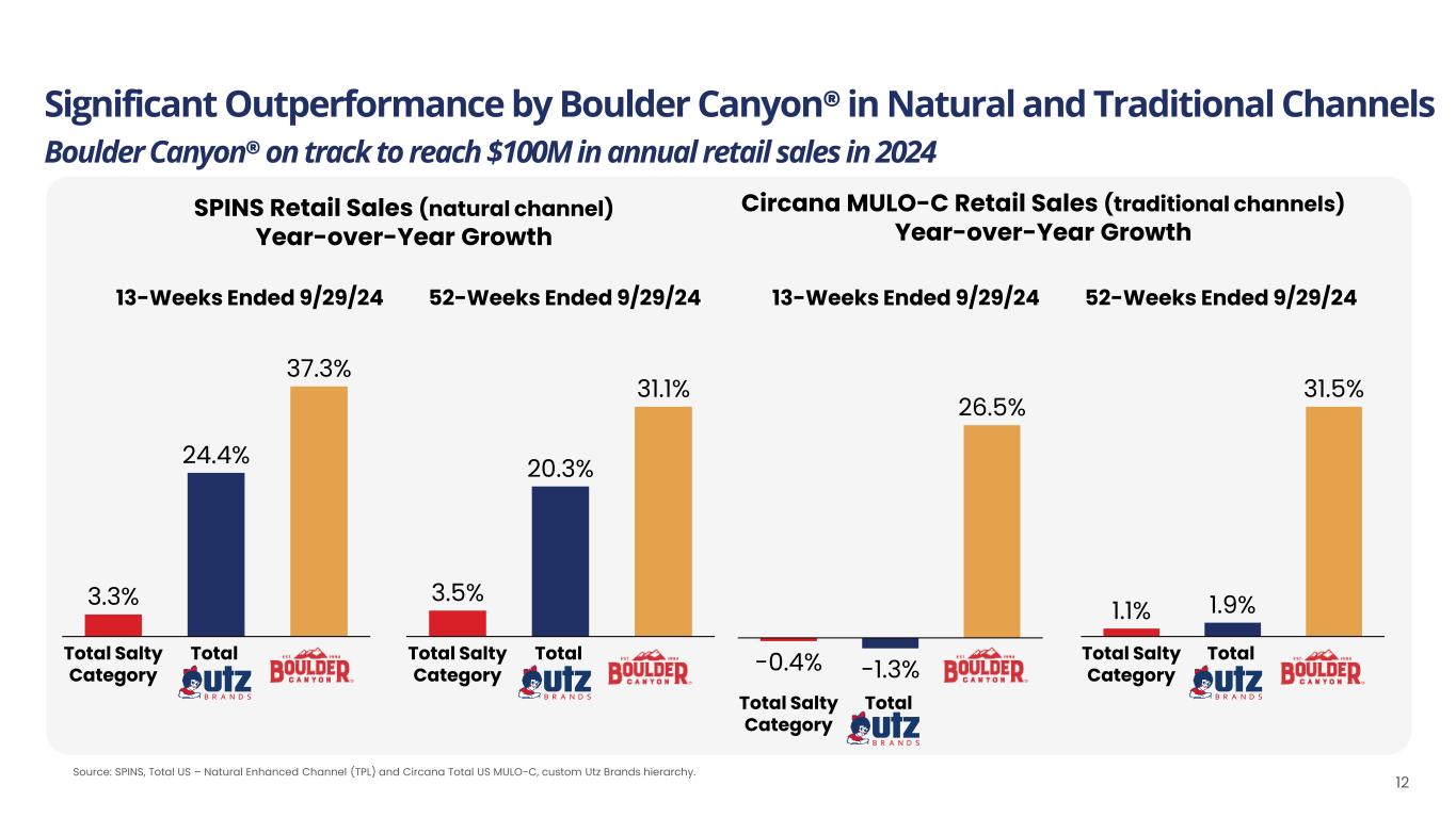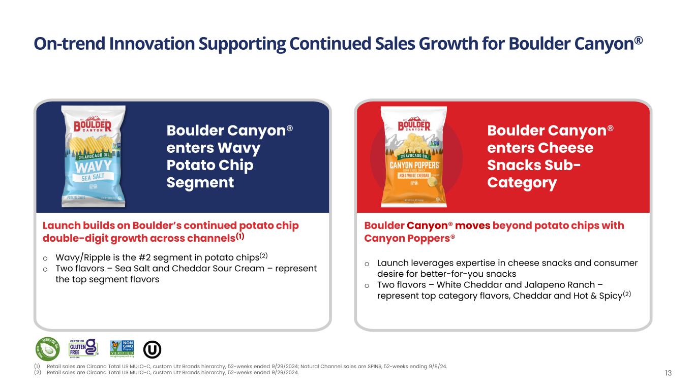 Significant Outperformance by Boulder Canyon® in Natural and Traditional Channels Boulder Canyon® on track to reach $100M in annual retail sales in 2024 12 Source: SPINS, Total US – Natural Enhanced Channel (TPL) and Circana Total US MULO-C, custom Utz Brands hierarchy. Total Salty Category Total 3.3% 24.4% 37.3% Total Salty Category Total 3.5% 20.3% 31.1% SPINS Retail Sales (natural channel) Year-over-Year Growth 13-Weeks Ended 9/29/24 52-Weeks Ended 9/29/24 Total Salty Category Total -0.4% -1.3% 26.5% Total Salty Category Total 1.1% 1.9% 31.5% Circana MULO-C Retail Sales (traditional channels) Year-over-Year Growth 13-Weeks Ended 9/29/24 52-Weeks Ended 9/29/24