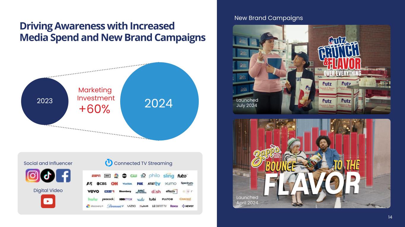 On-trend Innovation Supporting Continued Sales Growth for Boulder Canyon® 13 Boulder Canyon® moves beyond potato chips with Canyon Poppers® o Launch leverages expertise in cheese snacks and consumer desire for better-for-you snacks o Two flavors – White Cheddar and Jalapeno Ranch – represent top category flavors, Cheddar and Hot & Spicy(2) Boulder Canyon® enters Cheese Snacks Sub- Category Launch builds on Boulder’s continued potato chip double-digit growth across channels(1) o Wavy/Ripple is the #2 segment in potato chips(2) o Two flavors – Sea Salt and Cheddar Sour Cream – represent the top segment flavors (1) Retail sales are Circana Total US MULO-C, custom Utz Brands hierarchy, 52-weeks ended 9/29/2024; Natural Channel sales are SPINS, 52-weeks ending 9/8/24. (2) Retail sales are Circana Total US MULO-C, custom Utz Brands hierarchy, 52-weeks ended 9/29/2024. Boulder Canyon® enters Wavy Potato Chip Segment