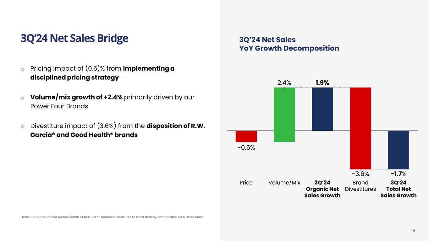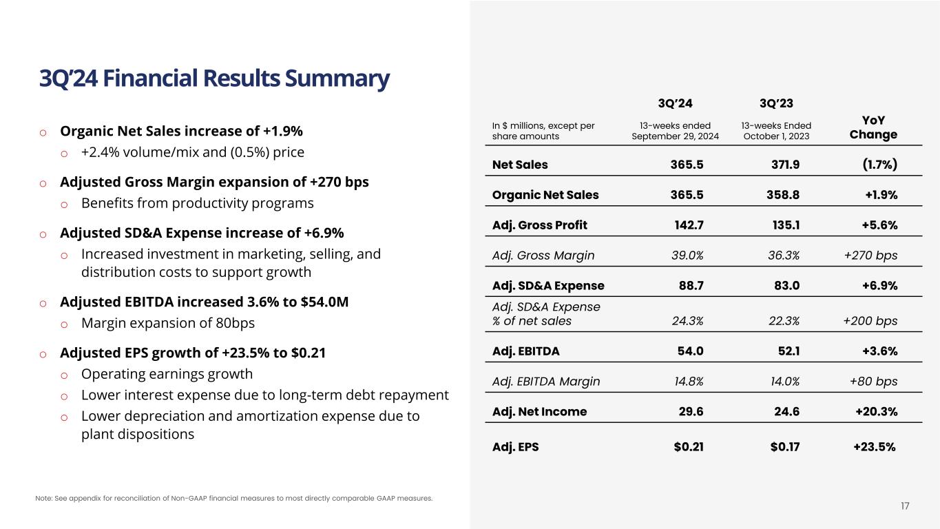 3Q’24 Financial Results Summary o Organic Net Sales increase of +1.9% o +2.4% volume/mix and (0.5%) price o Adjusted Gross Margin expansion of +270 bps o Benefits from productivity programs o Adjusted SD&A Expense increase of +6.9% o Increased investment in marketing, selling, and distribution costs to support growth o Adjusted EBITDA increased 3.6% to $54.0M o Margin expansion of 80bps o Adjusted EPS growth of +23.5% to $0.21 o Operating earnings growth o Lower interest expense due to long-term debt repayment o Lower depreciation and amortization expense due to plant dispositions 3Q’24 3Q’23 YoY Change In $ millions, except per share amounts 13-weeks ended September 29, 2024 13-weeks Ended October 1, 2023 Net Sales 365.5 371.9 (1.7%) Organic Net Sales 365.5 358.8 +1.9% Adj. Gross Profit 142.7 135.1 +5.6% Adj. Gross Margin 39.0% 36.3% +270 bps Adj. SD&A Expense 88.7 83.0 +6.9% Adj. SD&A Expense % of net sales 24.3% 22.3% +200 bps Adj. EBITDA 54.0 52.1 +3.6% Adj. EBITDA Margin 14.8% 14.0% +80 bps Adj. Net Income 29.6 24.6 +20.3% Adj. EPS $0.21 $0.17 +23.5% 17 Note: See appendix for reconciliation of Non-GAAP financial measures to most directly comparable GAAP measures.