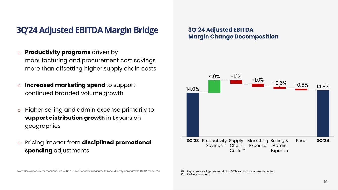 3Q’24 Net Sales Bridge 18 o Pricing impact of (0.5)% from implementing a disciplined pricing strategy o Volume/mix growth of +2.4% primarily driven by our Power Four Brands o Divestiture impact of (3.6%) from the disposition of R.W. Garcia® and Good Health® brands 3Q’24 Net Sales YoY Growth Decomposition Price 2.4% Volume/Mix 3Q’24 Organic Net Sales Growth -3.6% Brand Divestitures 3Q’24 Total Net Sales Growth -0.5% 1.9% -1.7% Note: See appendix for reconciliation of Non-GAAP financial measures to most directly comparable GAAP measures.