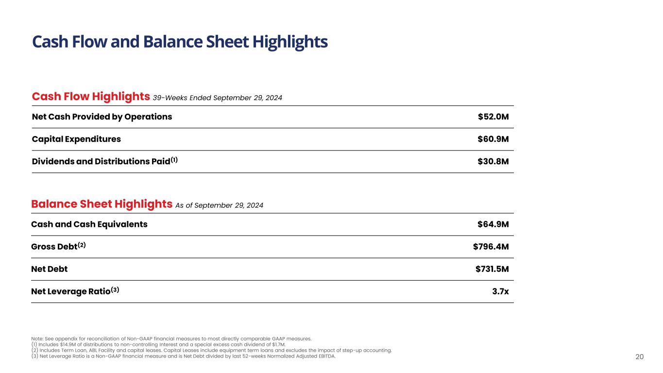 Cash Flow and Balance Sheet Highlights As of January 1, 2023 Cash Flow Highlights 39-Weeks Ended September 29, 2024 Net Cash Provided by Operations $52.0M Capital Expenditures $60.9M Dividends and Distributions Paid(1) $30.8M Balance Sheet Highlights As of September 29, 2024 Cash and Cash Equivalents $64.9M Gross Debt(2) $796.4M Net Debt $731.5M Net Leverage Ratio(3) 3.7x 20 Note: See appendix for reconciliation of Non-GAAP financial measures to most directly comparable GAAP measures. (1) Includes $14.9M of distributions to non-controlling Interest and a special excess cash dividend of $1.7M. (2) Includes Term Loan, ABL Facility and capital leases. Capital Leases include equipment term loans and excludes the impact of step-up accounting. (3) Net Leverage Ratio is a Non-GAAP financial measure and is Net Debt divided by last 52-weeks Normalized Adjusted EBITDA.
