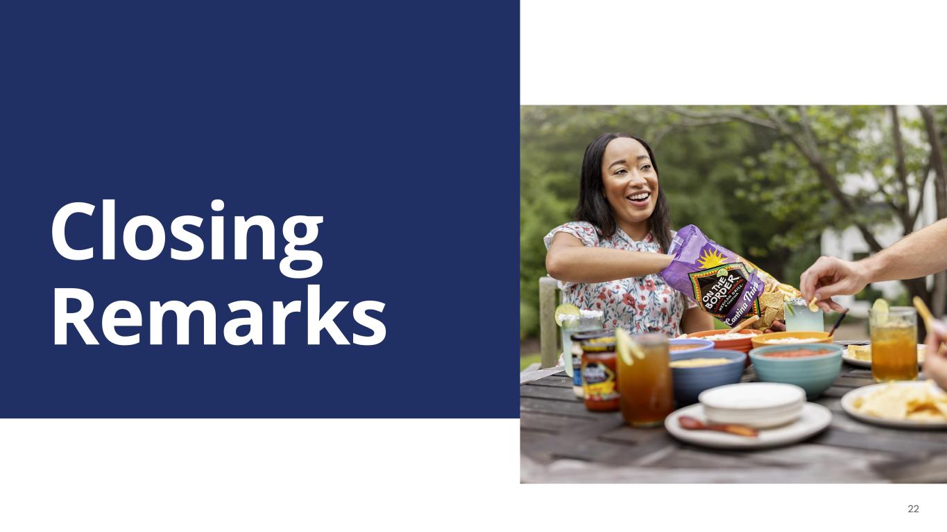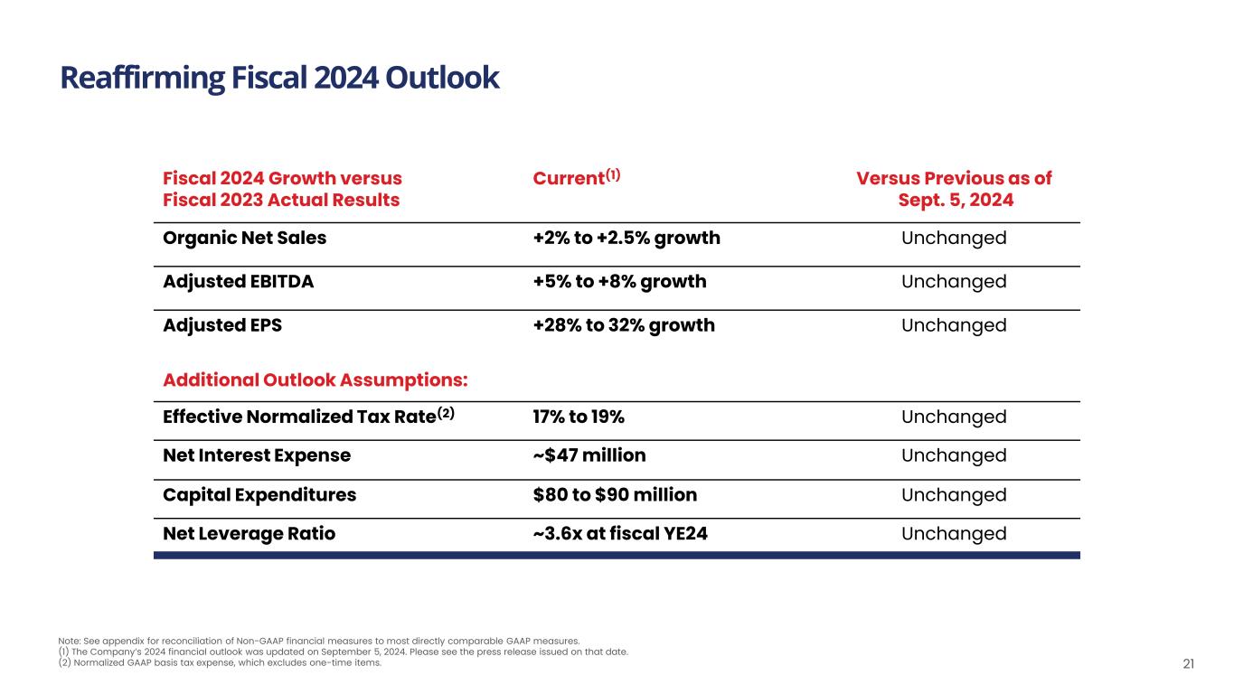 Note: See appendix for reconciliation of Non-GAAP financial measures to most directly comparable GAAP measures. (1) The Company’s 2024 financial outlook was updated on September 5, 2024. Please see the press release issued on that date. (2) Normalized GAAP basis tax expense, which excludes one-time items. Fiscal 2024 Growth versus Fiscal 2023 Actual Results Current(1) Versus Previous as of Sept. 5, 2024 Organic Net Sales +2% to +2.5% growth Unchanged Adjusted EBITDA +5% to +8% growth Unchanged Adjusted EPS +28% to 32% growth Unchanged Additional Outlook Assumptions: Effective Normalized Tax Rate(2) 17% to 19% Unchanged Net Interest Expense ~$47 million Unchanged Capital Expenditures $80 to $90 million Unchanged Net Leverage Ratio ~3.6x at fiscal YE24 Unchanged Reaffirming Fiscal 2024 Outlook 21