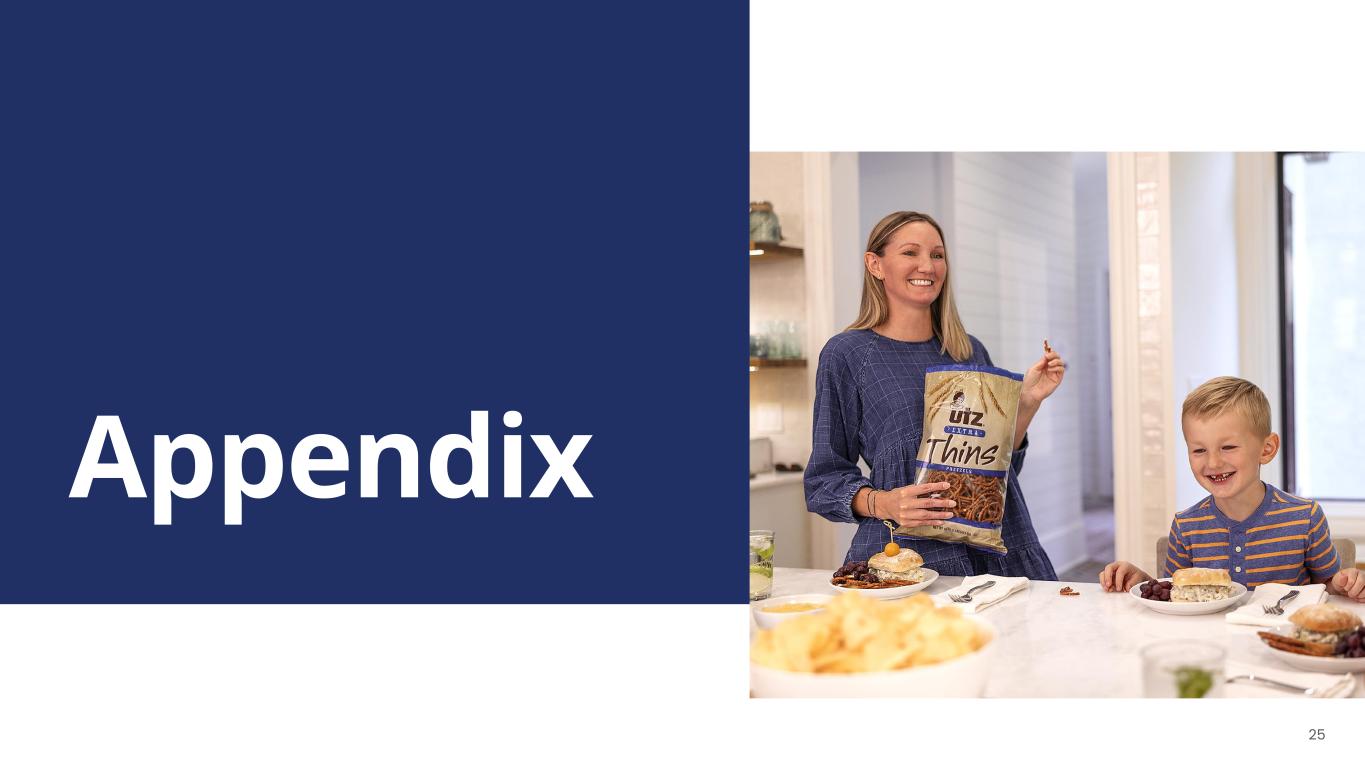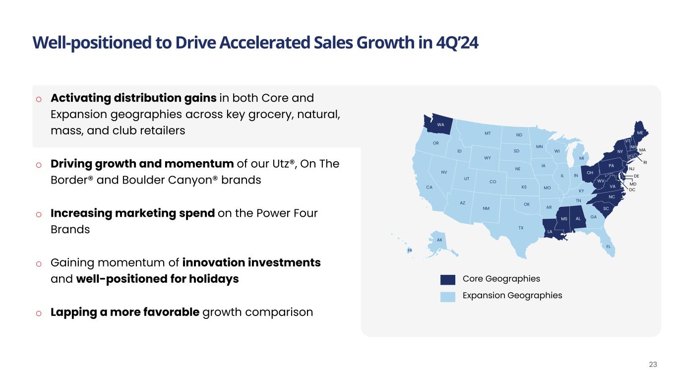 Well-positioned to Drive Accelerated Sales Growth in 4Q’24 23 o Activating distribution gains in both Core and Expansion geographies across key grocery, natural, mass, and club retailers o Driving growth and momentum of our Utz®, On The Border® and Boulder Canyon® brands o Increasing marketing spend on the Power Four Brands o Gaining momentum of innovation investments and well-positioned for holidays o Lapping a more favorable growth comparison FL NM DE MD TX OK KS NE SD NDMT WY CO UT ID AZ NV WA CA OR KY ME NY PA VT NH MA RI CT WV INIL NC TN SC ALMS AR LA MO IA MN WI NJ GA DC VA OH MI HI AK Core Geographies Expansion Geographies
