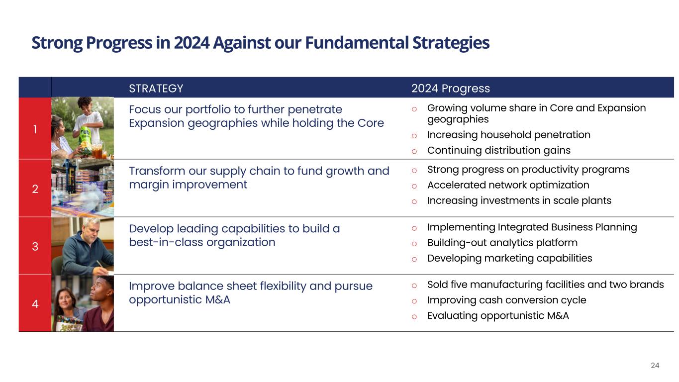 STRATEGY 2024 Progress 1 Focus our portfolio to further penetrate Expansion geographies while holding the Core o Growing volume share in Core and Expansion geographies o Increasing household penetration o Continuing distribution gains 2 Transform our supply chain to fund growth and margin improvement o Strong progress on productivity programs o Accelerated network optimization o Increasing investments in scale plants 3 Develop leading capabilities to build a best-in-class organization o Implementing Integrated Business Planning o Building-out analytics platform o Developing marketing capabilities 4 Improve balance sheet flexibility and pursue opportunistic M&A o Sold five manufacturing facilities and two brands o Improving cash conversion cycle o Evaluating opportunistic M&A Strong Progress in 2024 Against our Fundamental Strategies 24