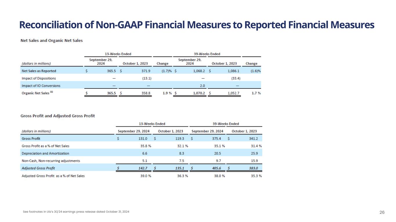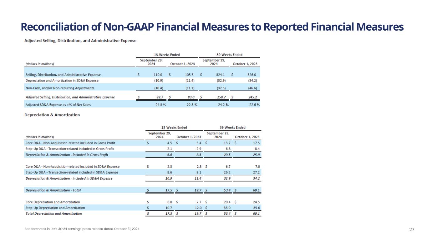 Reconciliation of Non-GAAP Financial Measures to Reported Financial Measures 26See footnotes in Utz’s 3Q’24 earnings press release dated October 31, 2024