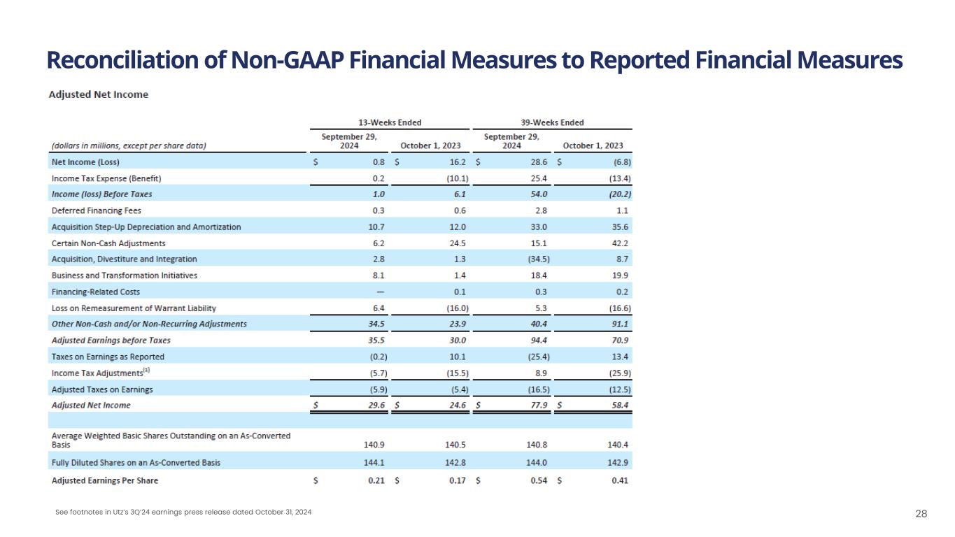 Reconciliation of Non-GAAP Financial Measures to Reported Financial Measures 27See footnotes in Utz’s 3Q’24 earnings press release dated October 31, 2024