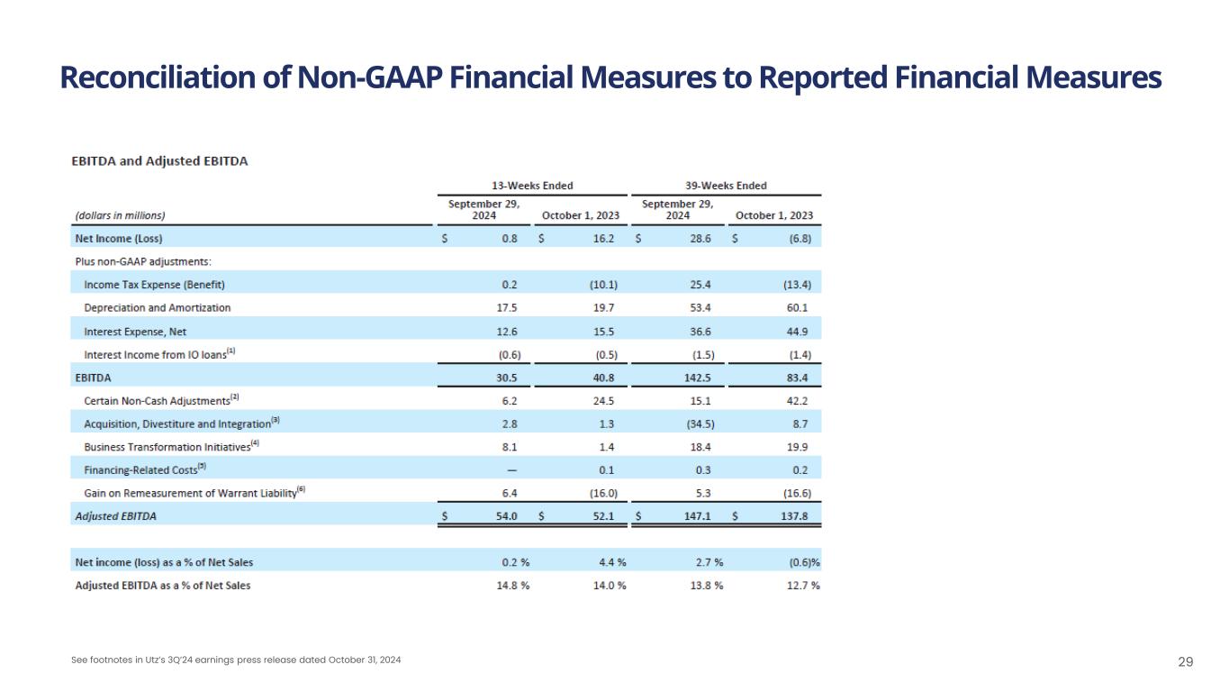 Reconciliation of Non-GAAP Financial Measures to Reported Financial Measures 28See footnotes in Utz’s 3Q’24 earnings press release dated October 31, 2024