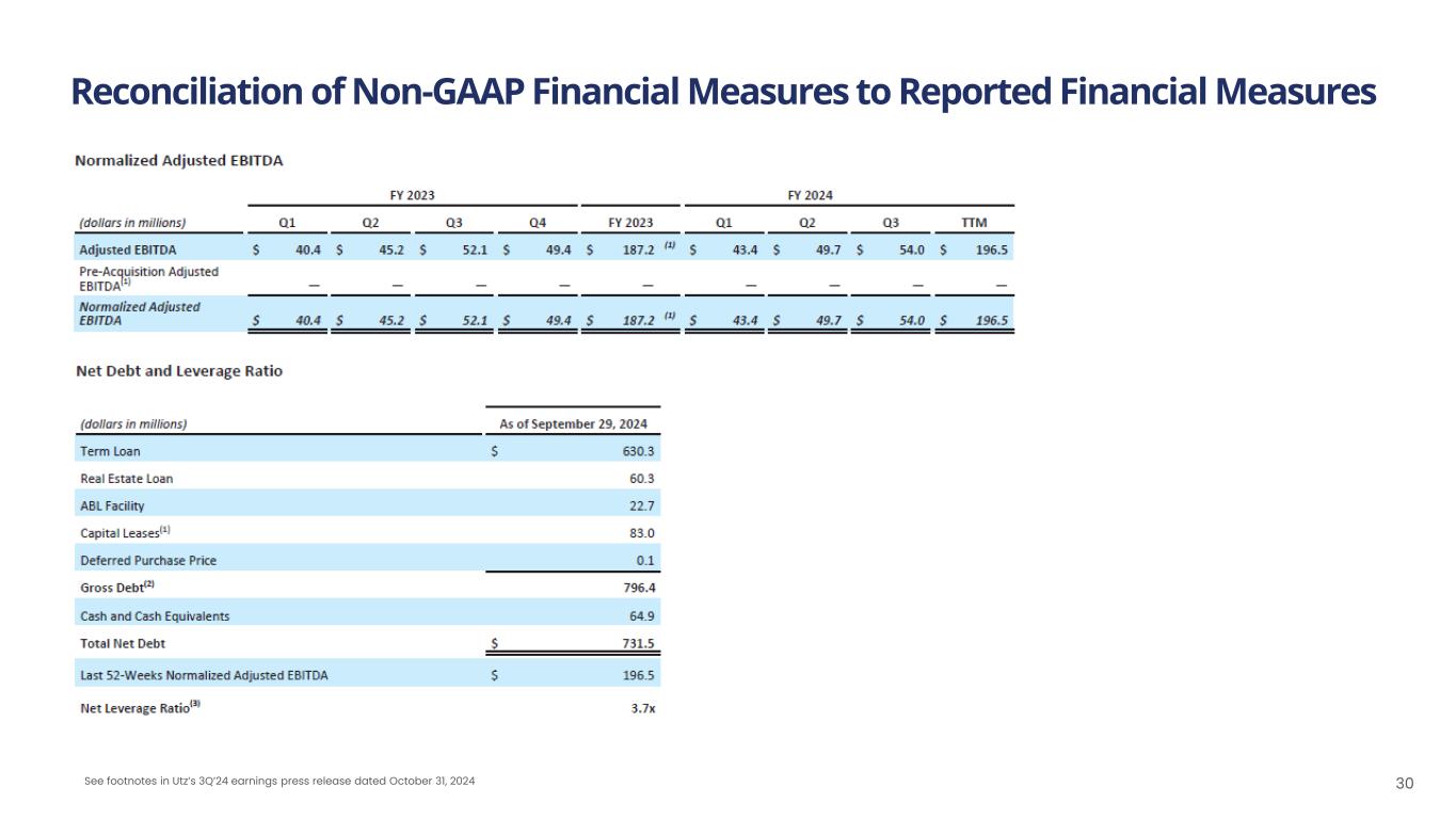 Reconciliation of Non-GAAP Financial Measures to Reported Financial Measures 29See footnotes in Utz’s 3Q’24 earnings press release dated October 31, 2024