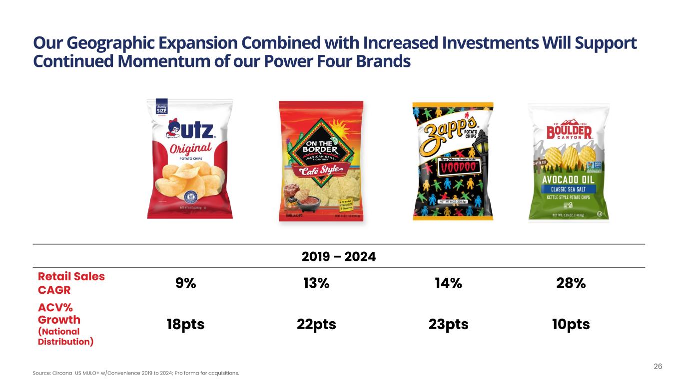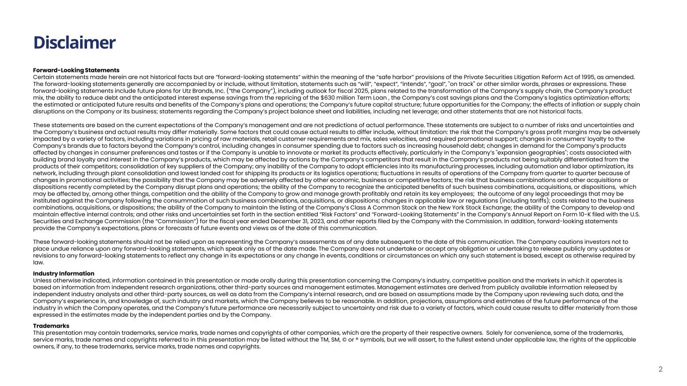 Disclaimer 2 Forward-Looking Statements Certain statements made herein are not historical facts but are “forward-looking statements” within the meaning of the “safe harbor” provisions of the Private Securities Litigation Reform Act of 1995, as amended. The forward-looking statements generally are accompanied by or include, without limitation, statements such as “will”, “expect”, “intends”, “goal”, "on track" or other similar words, phrases or expressions. These forward-looking statements include future plans for Utz Brands, Inc. (“the Company”), including outlook for fiscal 2025, plans related to the transformation of the Company’s supply chain, the Company’s product mix, the ability to reduce debt and the anticipated interest expense savings from the repricing of the $630 million Term Loan , the Company’s cost savings plans and the Company’s logistics optimization efforts; the estimated or anticipated future results and benefits of the Company’s plans and operations; the Company’s future capital structure; future opportunities for the Company; the effects of inflation or supply chain disruptions on the Company or its business; statements regarding the Company’s project balance sheet and liabilities, including net leverage; and other statements that are not historical facts. These statements are based on the current expectations of the Company’s management and are not predictions of actual performance. These statements are subject to a number of risks and uncertainties and the Company’s business and actual results may differ materially. Some factors that could cause actual results to differ include, without limitation: the risk that the Company’s gross profit margins may be adversely impacted by a variety of factors, including variations in pricing of raw materials, retail customer requirements and mix, sales velocities, and required promotional support; changes in consumers’ loyalty to the Company’s brands due to factors beyond the Company’s control, including changes in consumer spending due to factors such as increasing household debt; changes in demand for the Company’s products affected by changes in consumer preferences and tastes or if the Company is unable to innovate or market its products effectively, particularly in the Company’s "expansion geographies"; costs associated with building brand loyalty and interest in the Company’s products, which may be affected by actions by the Company’s competitors that result in the Company’s products not being suitably differentiated from the products of their competitors; consolidation of key suppliers of the Company; any inability of the Company to adopt efficiencies into its manufacturing processes, including automation and labor optimization, its network, including through plant consolidation and lowest landed cost for shipping its products or its logistics operations; fluctuations in results of operations of the Company from quarter to quarter because of changes in promotional activities; the possibility that the Company may be adversely affected by other economic, business or competitive factors; the risk that business combinations and other acquisitions or dispositions recently completed by the Company disrupt plans and operations; the ability of the Company to recognize the anticipated benefits of such business combinations, acquisitions, or dispositions, which may be affected by, among other things, competition and the ability of the Company to grow and manage growth profitably and retain its key employees; the outcome of any legal proceedings that may be instituted against the Company following the consummation of such business combinations, acquisitions, or dispositions; changes in applicable law or regulations (including tariffs); costs related to the business combinations, acquisitions, or dispositions; the ability of the Company to maintain the listing of the Company’s Class A Common Stock on the New York Stock Exchange; the ability of the Company to develop and maintain effective internal controls; and other risks and uncertainties set forth in the section entitled “Risk Factors” and “Forward-Looking Statements” in the Company’s Annual Report on Form 10-K filed with the U.S. Securities and Exchange Commission (the “Commission”) for the fiscal year ended December 31, 2023, and other reports filed by the Company with the Commission. In addition, forward-looking statements provide the Company’s expectations, plans or forecasts of future events and views as of the date of this communication. These forward-looking statements should not be relied upon as representing the Company’s assessments as of any date subsequent to the date of this communication. The Company cautions investors not to place undue reliance upon any forward-looking statements, which speak only as of the date made. The Company does not undertake or accept any obligation or undertaking to release publicly any updates or revisions to any forward-looking statements to reflect any change in its expectations or any change in events, conditions or circumstances on which any such statement is based, except as otherwise required by law. Industry Information Unless otherwise indicated, information contained in this presentation or made orally during this presentation concerning the Company’s industry, competitive position and the markets in which it operates is based on information from independent research organizations, other third-party sources and management estimates. Management estimates are derived from publicly available information released by independent industry analysts and other third-party sources, as well as data from the Company’s internal research, and are based on assumptions made by the Company upon reviewing such data, and the Company’s experience in, and knowledge of, such industry and markets, which the Company believes to be reasonable. In addition, projections,
