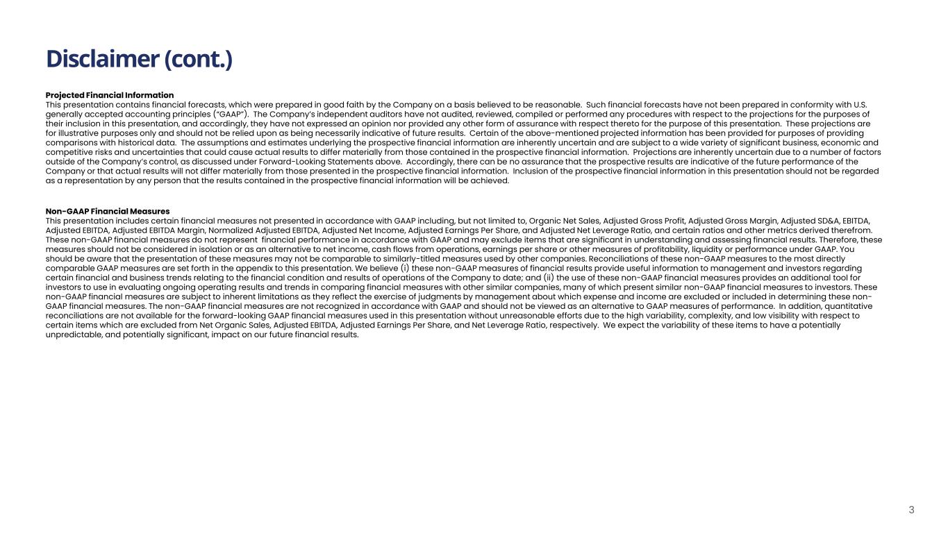 Disclaimer (cont.) 3 Projected Financial Information This presentation contains financial forecasts, which were prepared in good faith by the Company on a basis believed to be reasonable. Such financial forecasts have not been prepared in conformity with U.S. generally accepted accounting principles (“GAAP”). The Company’s independent auditors have not audited, reviewed, compiled or performed any procedures with respect to the projections for the purposes of their inclusion in this presentation, and accordingly, they have not expressed an opinion nor provided any other form of assurance with respect thereto for the purpose of this presentation. These projections are for illustrative purposes only and should not be relied upon as being necessarily indicative of future results. Certain of the above-mentioned projected information has been provided for purposes of providing comparisons with historical data. The assumptions and estimates underlying the prospective financial information are inherently uncertain and are subject to a wide variety of significant business, economic and competitive risks and uncertainties that could cause actual results to differ materially from those contained in the prospective financial information. Projections are inherently uncertain due to a number of factors outside of the Company’s control, as discussed under Forward-Looking Statements above. Accordingly, there can be no assurance that the prospective results are indicative of the future performance of the Company or that actual results will not differ materially from those presented in the prospective financial information. Inclusion of the prospective financial information in this presentation should not be regarded as a representation by any person that the results contained in the prospective financial information will be achieved. Non-GAAP Financial Measures This presentation includes certain financial measures not presented in accordance with GAAP including, but not limited to, Organic Net Sales, Adjusted Gross Profit, Adjusted Gross Margin, Adjusted SD&A, EBITDA, Adjusted EBITDA, Adjusted EBITDA Margin, Normalized Adjusted EBITDA, Adjusted Net Income, Adjusted Earnings Per Share, and Adjusted Net Leverage Ratio, and certain ratios and other metrics derived therefrom. These non-GAAP financial measures do not represent financial performance in accordance with GAAP and may exclude items that are significant in understanding and assessing financial results. Therefore, these measures should not be considered in isolation or as an alternative to net income, cash flows from operations, earnings per share or other measures of profitability, liquidity or performance under GAAP. You should be aware that the presentation of these measures may not be comparable to similarly-titled measures used by other companies. Reconciliations of these non-GAAP measures to the most directly comparable GAAP measures are set forth in the appendix to this presentation. We believe (i) these non-GAAP measures of financial results provide useful information to management and investors regarding certain financial and business trends relating to the financial condition and results of operations of the Company to date; and (ii) the use of these non-GAAP financial measures provides an additional tool for investors to use in evaluating ongoing operating results and trends in comparing financial measures with other similar companies, many of which present similar non-GAAP financial measures to investors. These non-GAAP financial measures are subject to inherent limitations as they reflect the exercise of judgments by management about which expense and income are excluded or included in determining these non- GAAP financial measures. The non-GAAP financial measures are not recognized in accordance with GAAP and should not be viewed as an alternative to GAAP measures of performance. In addition, quantitative reconciliations are not available for the forward-looking GAAP financial measures used in this presentation without unreasonable efforts due to the high variability, complexity, and low visibility with respect to certain items which are excluded from Net Organic Sales, Adjusted EBITDA, Adjusted Earnings Per Share, and Net Leverage Ratio, respectively. We expect the variability of these items to have a potentially unpredictable, and potentially significant, impact on our future financial results.