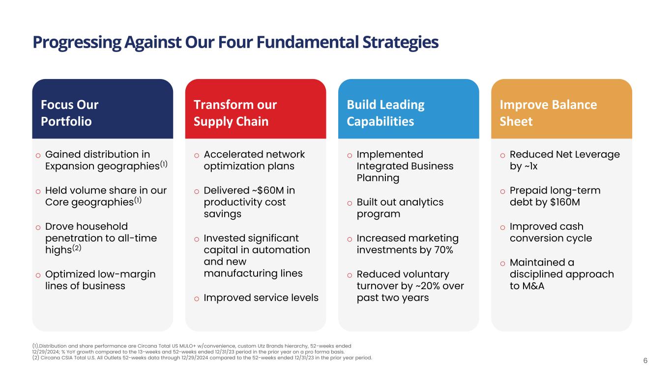 Strong Execution Against Our Goals in 2024 5 o Delivered Organic Net Sales growth of 1.3% led by Branded Salty Snacks growth of 3.7% o Gained volume share in both Core and Expansion geographies(1) o Increased marketing spend behind our brands by over 70% o Achieved productivity cost savings of ~$60M or ~6% of COGS(2) o Expanded Adj. Gross Margin by 260bps and Adj. EBITDA Margin by 120bps o Accelerated network optimization plans and reduced Net Leverage by ~1x o Drove Adjusted EPS growth of 35% (1).Retail volume are Circana Total US MULO+ w/convenience, custom Utz Brands hierarchy, 52-weeks ended 12/29/2024. (2) Represents savings realized during FY’24 as a % of prior year Adjusted Cost of Goods Sold.