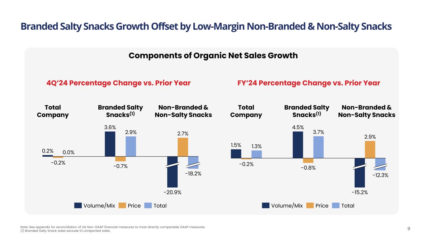 Introducing New Net Sales Breakdown Foundation Brands Being Split Into Branded Salty Snacks and Non-Branded & Non-Salty Snacks 8 79% 21% Old 3Q’24 Total Volume Breakdown(3) Power Brands(1) Foundation Brands(2) (1) Total Company Power Brands at the end of Q3 2024 included Utz®, On The Border®, Zapp’s®, Boulder Canyon®, Golden Flake® Pork, TGI Fridays®, Hawaiian®, Tim’s Cascade®, TORTYAHS®, Dirty®, and Jax®. (2) Total Company Foundation Brands at the end of Q3 2024 include Golden Flake® ex-Pork, Snyder of Berlin®, Bachman®, H.K. Anderson®, Vitner’s®, Kitchen Cooked®, Wachusett®, and other small brands, and also includes Partner Brands, Private Label, Co-Manufacturing, and Utz Branded non-salty snacks such as On The Border® Dips and Salsa. (3) Source: Total company volume. Internal company data. (4) Branded Salty Snacks include Power Four Brands and Other Brands. Power Four Brands include the Utz® brand, On The Border®, Zapp’s®, and Boulder Canyon®. Other Brands include Golden Flake®, TORTIYAHS!®, Hawaiian®, Bachman®, Tim’s Cascade®, Dirty Potato Chips®, TGI Fridays®, Golden Flake® ex-Pork, Snyder of Berlin®, Bachman®, H.K. Anderson®, Vitner’s®, Kitchen Cooked®, Wachusett®, and other small brands. (5) Non-Branded & Non-Salty Snacks includes partner brands, private label, co-manufacturing for which we are the manufacturer, Utz branded non-salty snacks such as On The Border® Dips and Salsa, and sales not attributable to specific brand. Previously total company volume split between Power and Foundation Brands... 89% 11% Branded Salty Snacks(4) Non-Branded & Non-Salty Snacks(5) ..Now showing net sales split between Branded Salty Snacks and Non-Branded & Non-Salty Snacks New 4Q’24 Total Company Net Sales Breakdown • Foundation Branded Salty Snacks • Dips & Salsa • Partner Brands • Private Label • Co-Manufacturing • Power Four Brands • Other Branded Salty Snacks • Dips & Salsas • Partner Brands • Private Label • Co-manufacturing