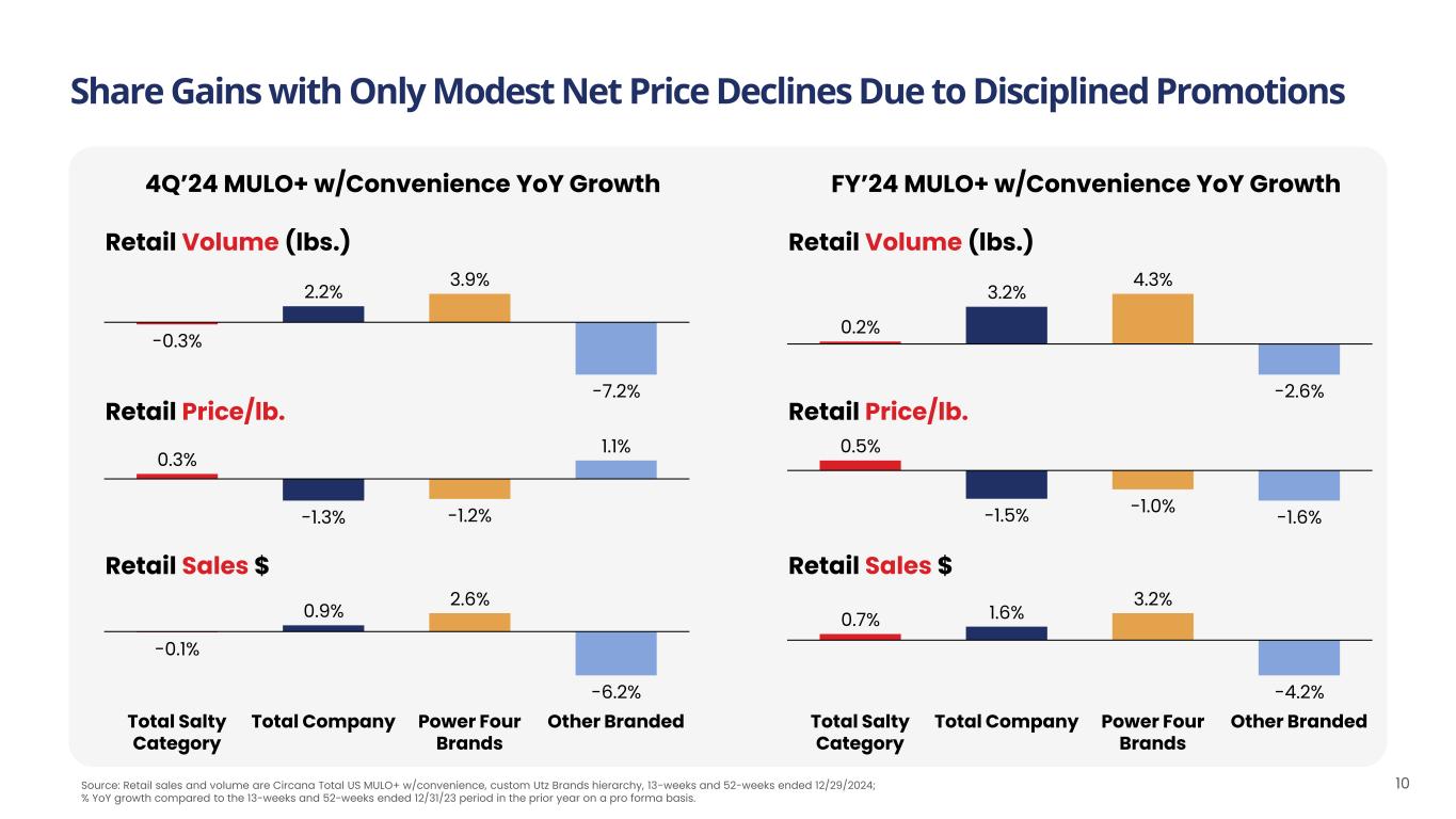 9Note: See appendix for reconciliation of Utz Non-GAAP financial measures to most directly comparable GAAP measures (1) Branded Salty Snack sales exclude IO unreported sales. FY’24 Percentage Change vs. Prior Year Branded Salty Snacks Growth Offset by Low-Margin Non-Branded & Non-Salty Snacks Branded Salty Snacks(1) Non-Branded & Non-Salty Snacks Total Company 0.2% -0.2% 0.0% 3.6% -0.7% 2.9% -20.9% 2.7% -18.2% 4Q’24 Percentage Change vs. Prior Year Volume/Mix Price Total Components of Organic Net Sales Growth Branded Salty Snacks(1) Non-Branded & Non-Salty Snacks Total Company 1.5% -0.2% 1.3% 4.5% -0.8% 3.7% -15.2% 2.9% -12.3% Volume/Mix Price Total