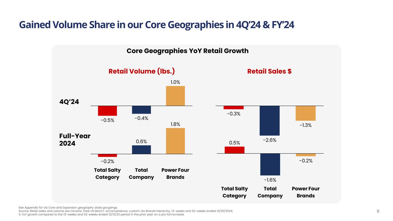 Share Gains with Only Modest Net Price Declines Due to Disciplined Promotions 10 FY’24 MULO+ w/Convenience YoY Growth 0.2% 3.2% 4.3% -2.6% Retail Volume (lbs.) Total Salty Category Total Company Power Four Brands Other Branded 0.7% 1.6% 3.2% -4.2% Retail Sales $ 0.5% -1.5% -1.0% -1.6% Retail Price/lb. 4Q’24 MULO+ w/Convenience YoY Growth -0.3% 2.2% 3.9% -7.2% Retail Volume (lbs.) Total Salty Category Total Company Power Four Brands Other Branded -0.1% 0.9% 2.6% -6.2% Retail Sales $ 0.3% -1.3% -1.2% 1.1% Retail Price/lb. Source: Retail sales and volume are Circana Total US MULO+ w/convenience, custom Utz Brands hierarchy, 13-weeks and 52-weeks ended 12/29/2024; % YoY growth compared to the 13-weeks and 52-weeks ended 12/31/23 period in the prior year on a pro forma basis.