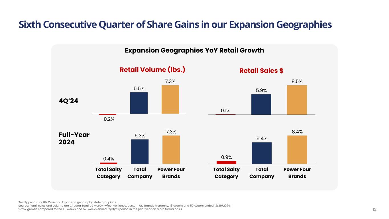 See Appendix for Utz Core and Expansion geography state groupings. Source: Retail sales and volume are Circana Total US MULO+ w/convenience, custom Utz Brands hierarchy, 13-weeks and 52-weeks ended 12/29/2024; % YoY growth compared to the 13-weeks and 52-weeks ended 12/31/23 period in the prior year on a pro forma basis. Gained Volume Share in our Core Geographies in 4Q’24 & FY’24 11 Core Geographies YoY Retail Growth -0.3% -2.6% -1.3% Total Salty Category Total Company Power Four Brands 0.5% -1.6% -0.2% -0.5% -0.4% 1.0% Total Salty Category Total Company Power Four Brands -0.2% 0.6% 1.8% 4Q’24 Full-Year 2024 Retail Volume (lbs.) Retail Sales $