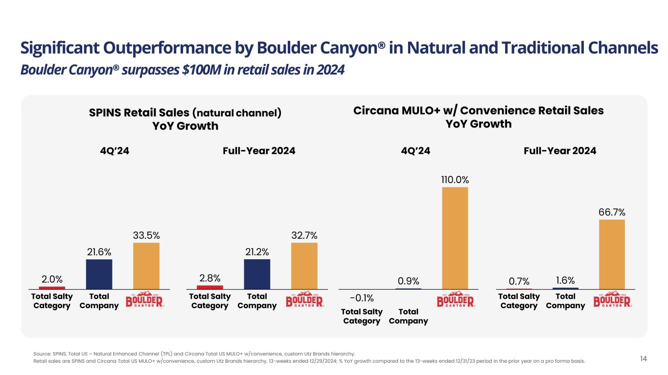 % of Utz Retail Sales 38% 19% 14% 10% 3% o Growth impacted by competitive promotional environment o Boulder Canyon® share gains fueled by distribution growth o On The Border® softness primarily driven by promotional timing in grocery channel o Planned TORTIYAHS!® decline due to space conversion to On The Border® o Utz® pretzels share gains led by grocery & club channels o Zapp’s® pretzels growth driven by food, mass & club o Utz® cheese snacks share gains led by mass and club channels with strong seasonal performance o Golden Flake® growth of 12% and gaining share Source: Retail sales are Circana Total US MULO+ w/convenience, custom Utz Brands hierarchy, 13-weeks ended 12/29/2024; % YoY growth compared to the 13-weeks ended 12/31/23 period in the prior year on a pro forma basis. Utz retail sales breakdown is Circana Total US MULO+ w/convenience, custom Utz Brands hierarchy, 13-weeks ended 12/29/2024. Total Sub-Category4Q’24 Sub-Category Retail Sales YoY Growth Potato Chips Tortilla Chips Pretzels Cheese Snacks Pork Rinds -0.8% 0.6% 1.7% -2.5% 2.2% 2.2% -4.0% 6.4% 1.5% 5.2% 13 Growth and Share Gains in Potato Chips, Cheese Snacks, and Pork