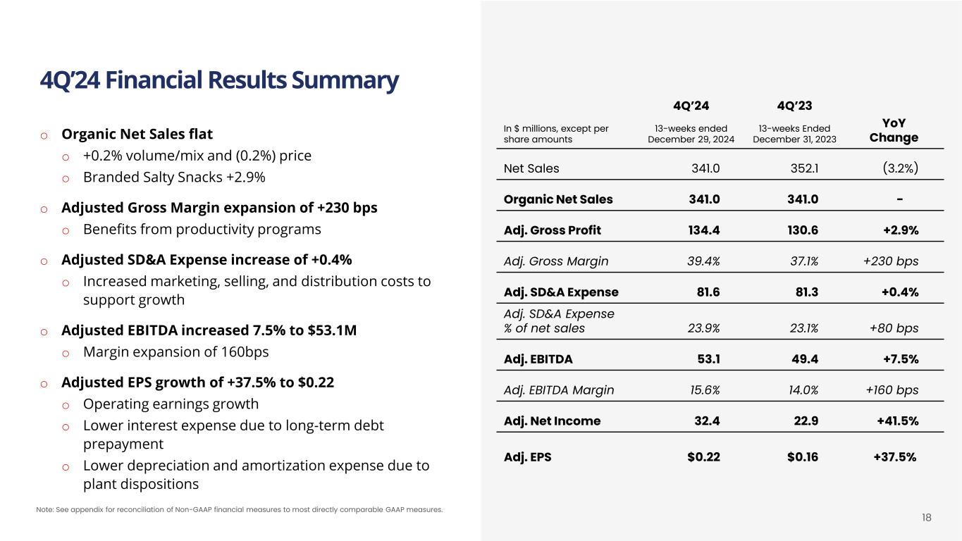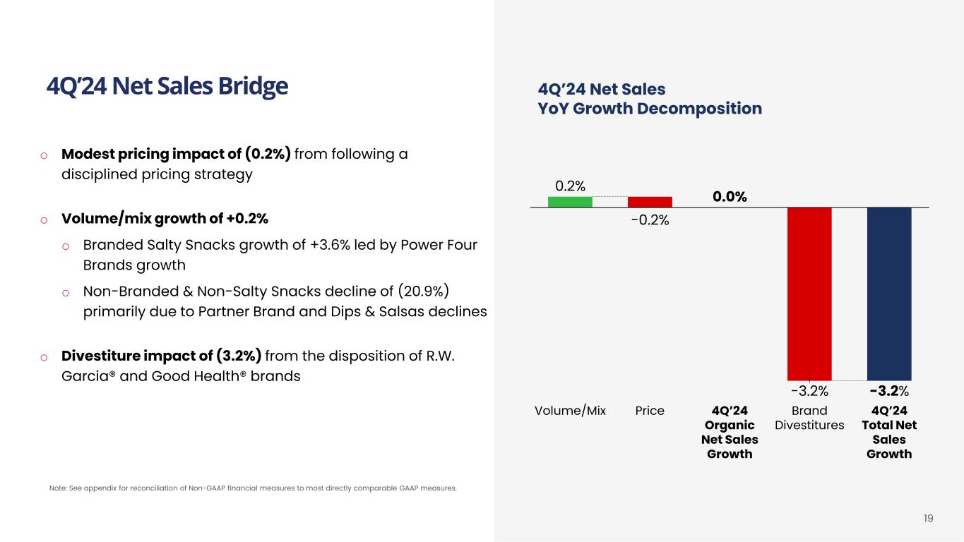 4Q’24 Financial Results Summary o Organic Net Sales flat o +0.2% volume/mix and (0.2%) price o Branded Salty Snacks +2.9% o Adjusted Gross Margin expansion of +230 bps o Benefits from productivity programs o Adjusted SD&A Expense increase of +0.4% o Increased marketing, selling, and distribution costs to support growth o Adjusted EBITDA increased 7.5% to $53.1M o Margin expansion of 160bps o Adjusted EPS growth of +37.5% to $0.22 o Operating earnings growth o Lower interest expense due to long-term debt prepayment o Lower depreciation and amortization expense due to plant dispositions 4Q’24 4Q’23 YoY Change In $ millions, except per share amounts 13-weeks ended December 29, 2024 13-weeks Ended December 31, 2023 Net Sales 341.0 352.1 (3.2%) Organic Net Sales 341.0 341.0 - Adj. Gross Profit 134.4 130.6 +2.9% Adj. Gross Margin 39.4% 37.1% +230 bps Adj. SD&A Expense 81.6 81.3 +0.4% Adj. SD&A Expense % of net sales 23.9% 23.1% +80 bps Adj. EBITDA 53.1 49.4 +7.5% Adj. EBITDA Margin 15.6% 14.0% +160 bps Adj. Net Income 32.4 22.9 +41.5% Adj. EPS $0.22 $0.16 +37.5% 18 Note: See appendix for reconciliation of Non-GAAP financial measures to most directly comparable GAAP measures.