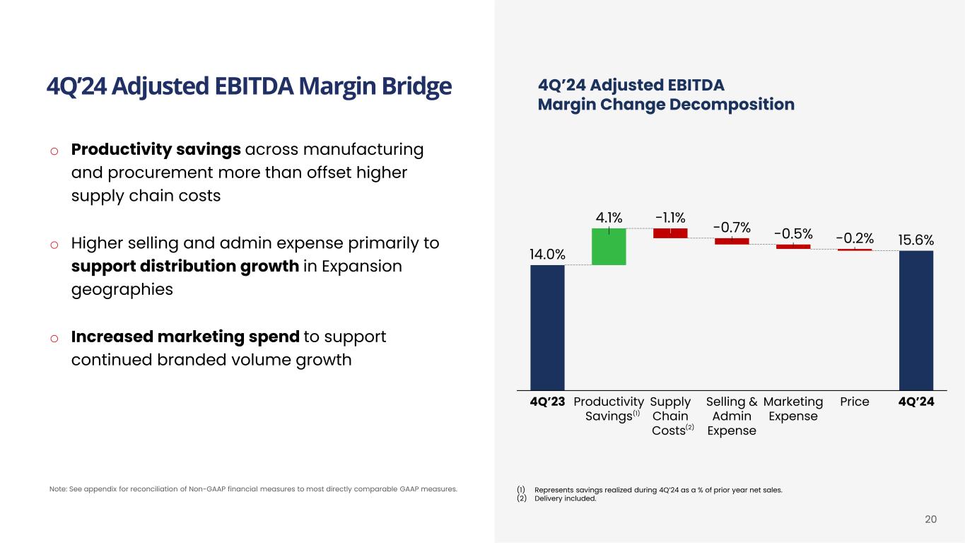 4Q’24 Adjusted EBITDA Margin Change Decomposition 4Q’24 Adjusted EBITDA Margin Bridge 20 o Productivity savings across manufacturing and procurement more than offset higher supply chain costs o Higher selling and admin expense primarily to support distribution growth in Expansion geographies o Increased marketing spend to support continued branded volume growth (1) Represents savings realized during 4Q’24 as a % of prior year net sales. (2) Delivery included. 4Q’23 4.1% Productivity Savings -1.1% Supply Chain Costs -0.7% Selling & Admin Expense -0.5% Marketing Expense -0.2% Price 4Q’24 14.0% 15.6% (1) (2) Note: See appendix for reconciliation of Non-GAAP financial measures to most directly comparable GAAP measures.
