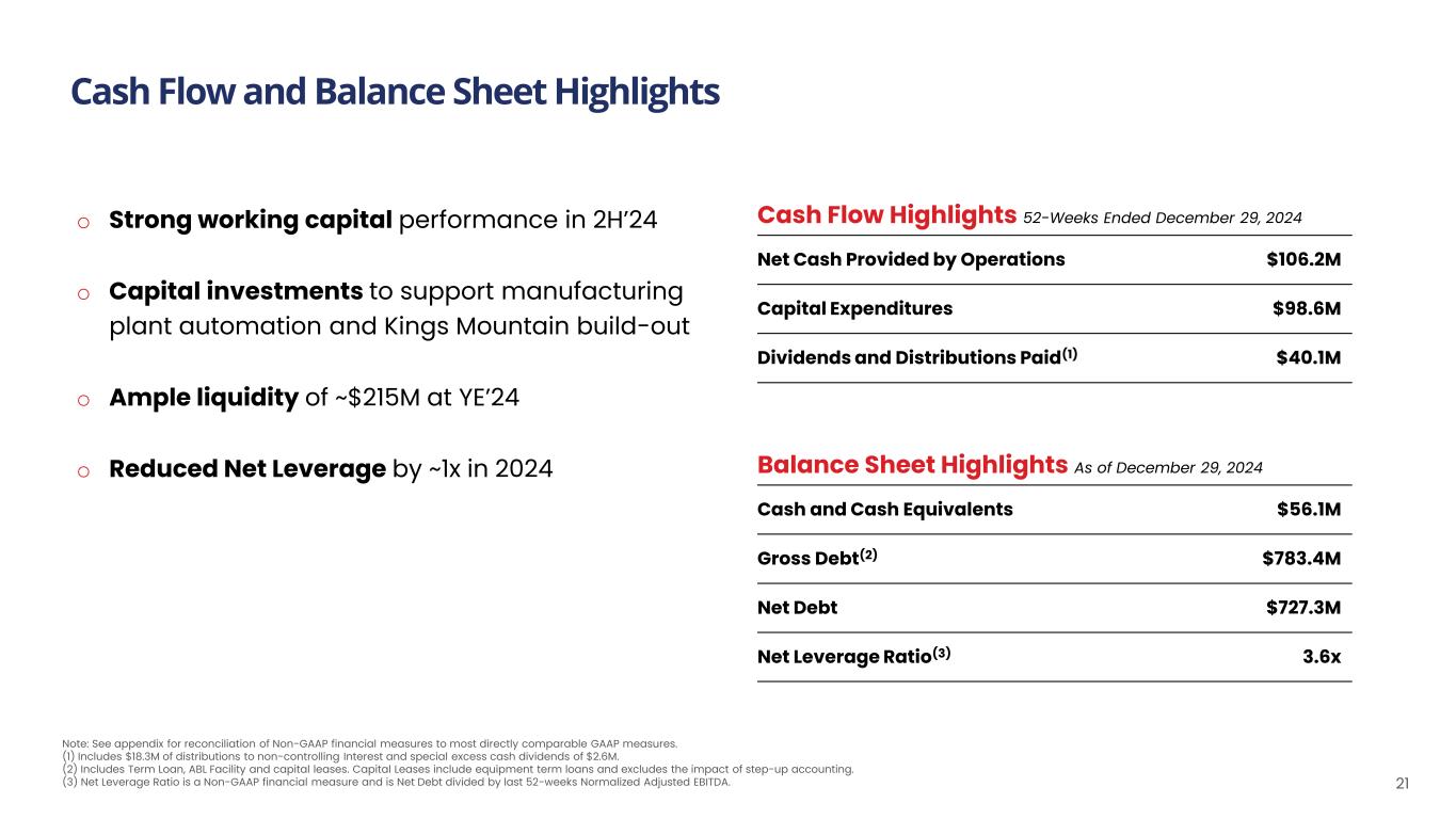Cash Flow and Balance Sheet Highlights As of January 1, 2023 Cash Flow Highlights 52-Weeks Ended December 29, 2024 Net Cash Provided by Operations $106.2M Capital Expenditures $98.6M Dividends and Distributions Paid(1) $40.1M Balance Sheet Highlights As of December 29, 2024 Cash and Cash Equivalents $56.1M Gross Debt(2) $783.4M Net Debt $727.3M Net Leverage Ratio(3) 3.6x 21 Note: See appendix for reconciliation of Non-GAAP financial measures to most directly comparable GAAP measures. (1) Includes $18.3M of distributions to non-controlling Interest and special excess cash dividends of $2.6M. (2) Includes Term Loan, ABL Facility and capital leases. Capital Leases include equipment term loans and excludes the impact of step-up accounting. (3) Net Leverage Ratio is a Non-GAAP financial measure and is Net Debt divided by last 52-weeks Normalized Adjusted EBITDA. o Strong working capital performance in 2H’24 o Capital investments to support manufacturing plant automation and Kings Mountain build-out o Ample liquidity of ~$215M at YE’24 o Reduced Net Leverage by ~1x in 2024