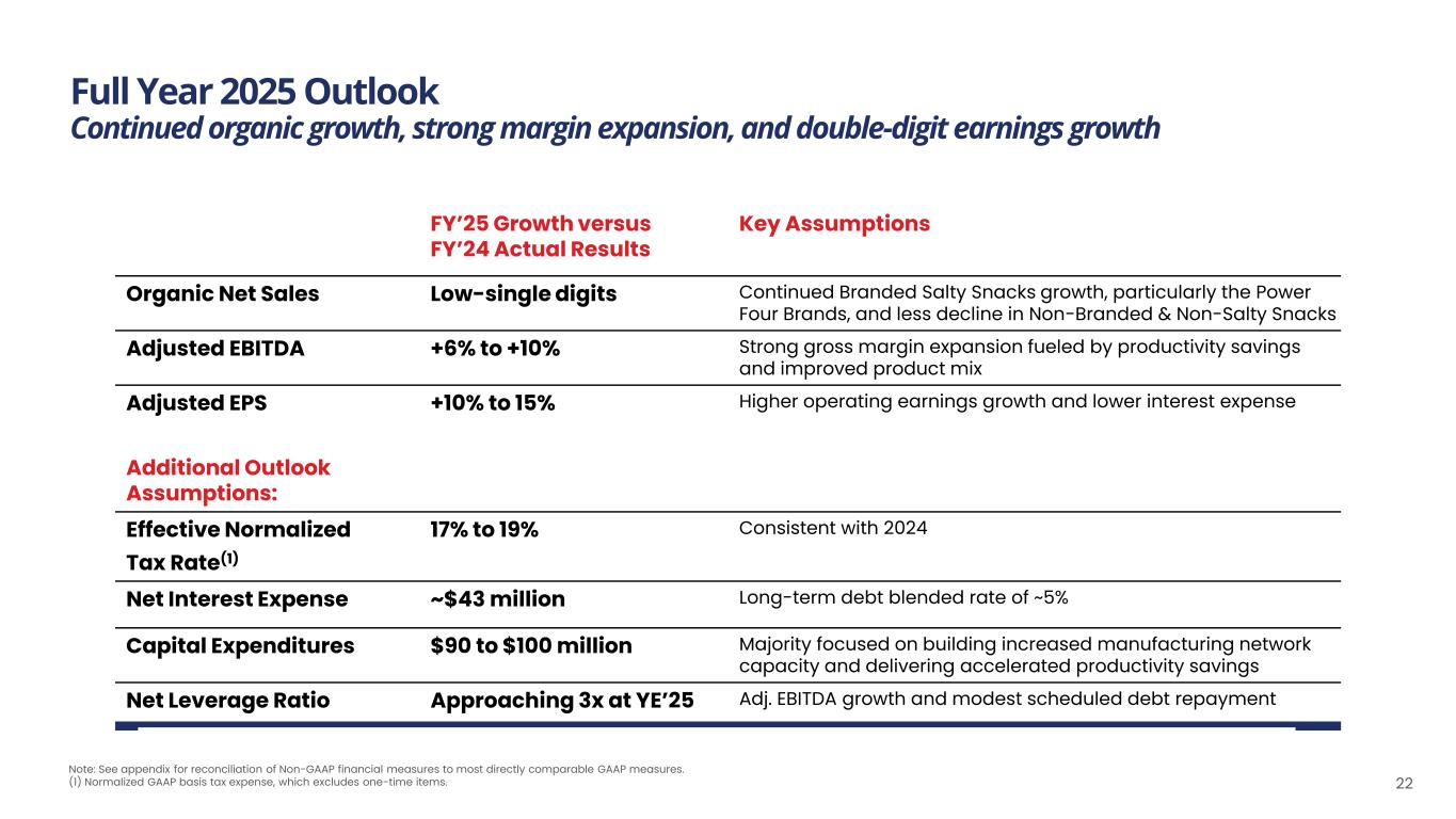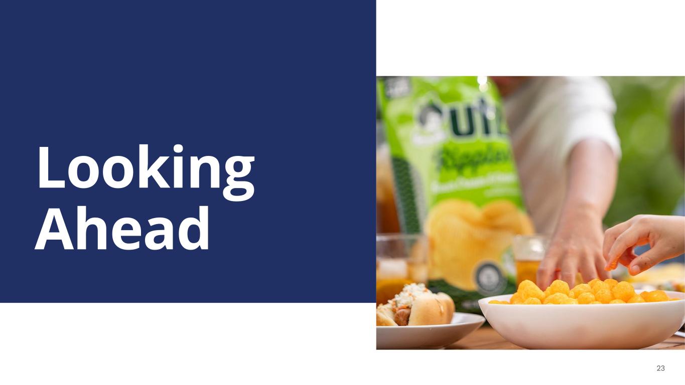 Note: See appendix for reconciliation of Non-GAAP financial measures to most directly comparable GAAP measures. (1) Normalized GAAP basis tax expense, which excludes one-time items. FY’25 Growth versus FY’24 Actual Results Key Assumptions Organic Net Sales Low-single digits Continued Branded Salty Snacks growth, particularly the Power Four Brands, and less decline in Non-Branded & Non-Salty Snacks Adjusted EBITDA +6% to +10% Strong gross margin expansion fueled by productivity savings and improved product mix Adjusted EPS +10% to 15% Higher operating earnings growth and lower interest expense Additional Outlook Assumptions: Effective Normalized Tax Rate(1) 17% to 19% Consistent with 2024 Net Interest Expense ~$43 million Long-term debt blended rate of ~5% Capital Expenditures $90 to $100 million Majority focused on building increased manufacturing network capacity and delivering accelerated productivity savings Net Leverage Ratio Approaching 3x at YE’25 Adj. EBITDA growth and modest scheduled debt repayment Full Year 2025 Outlook Continued organic growth, strong margin expansion, and double-digit earnings growth 22