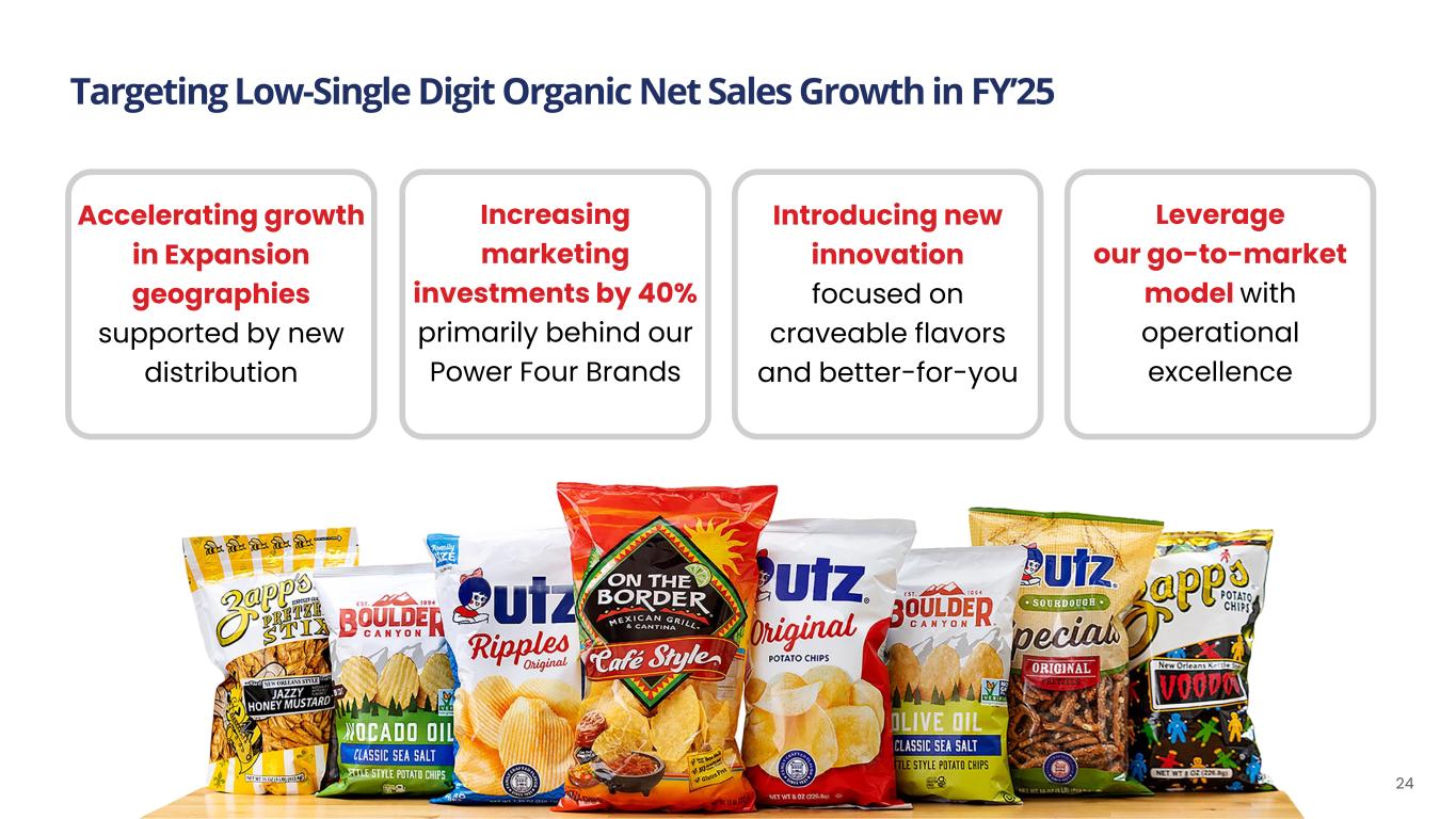 Targeting Low-Single Digit Organic Net Sales Growth in FY’25 24 Increasing marketing investments by 40% primarily behind our Power Four Brands Leverage our go-to-market model with operational excellence Introducing new innovation focused on craveable flavors and better-for-you Accelerating growth in Expansion geographies supported by new distribution