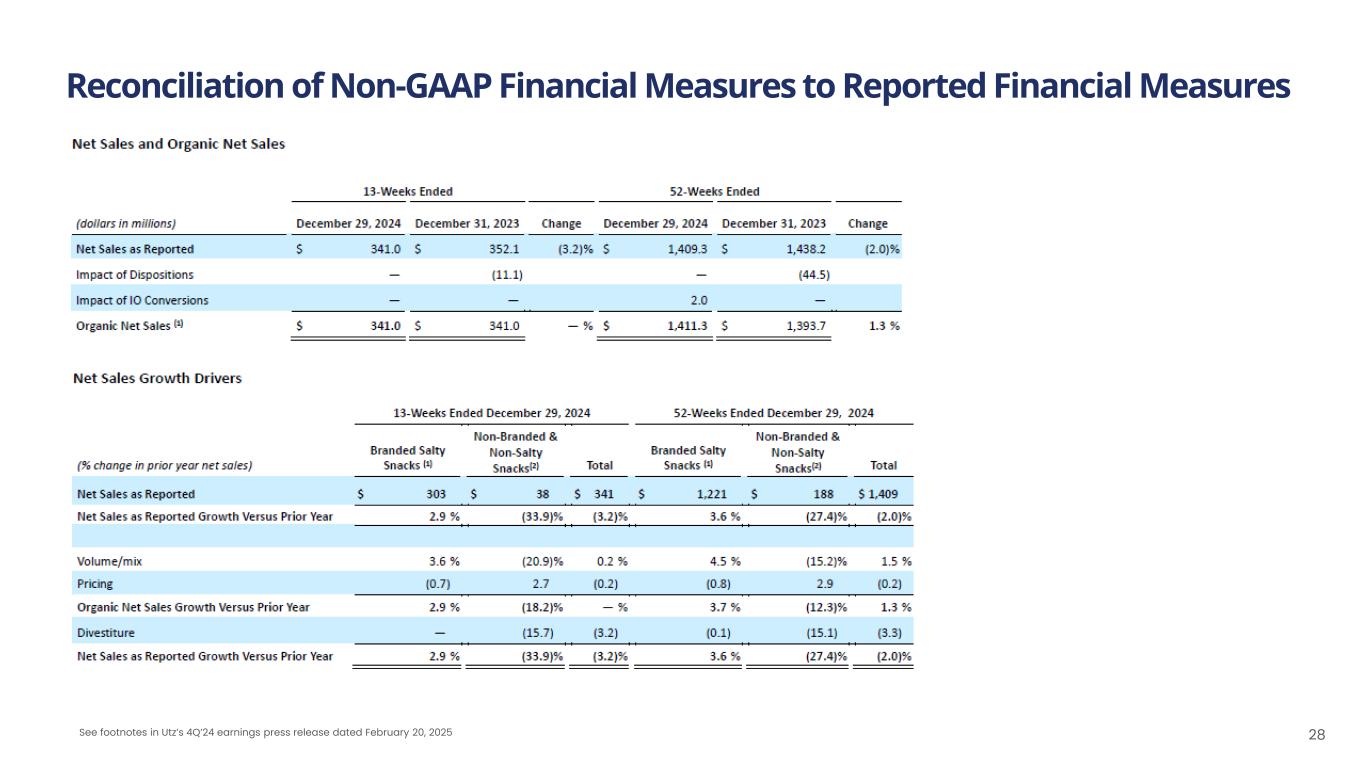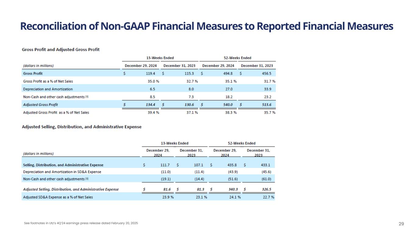 Reconciliation of Non-GAAP Financial Measures to Reported Financial Measures 28See footnotes in Utz’s 4Q’24 earnings press release dated February 20, 2025