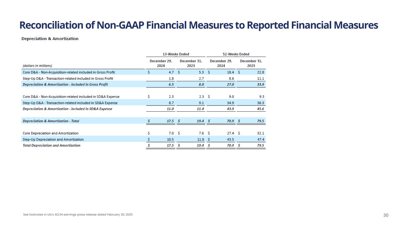 Reconciliation of Non-GAAP Financial Measures to Reported Financial Measures 29See footnotes in Utz’s 4Q’24 earnings press release dated February 20, 2025