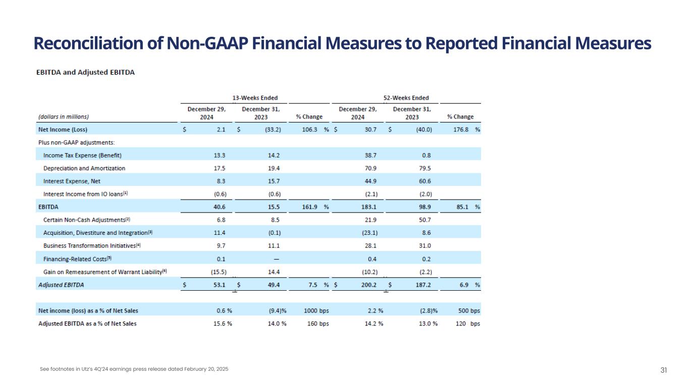 Reconciliation of Non-GAAP Financial Measures to Reported Financial Measures 30See footnotes in Utz’s 4Q’24 earnings press release dated February 20, 2025
