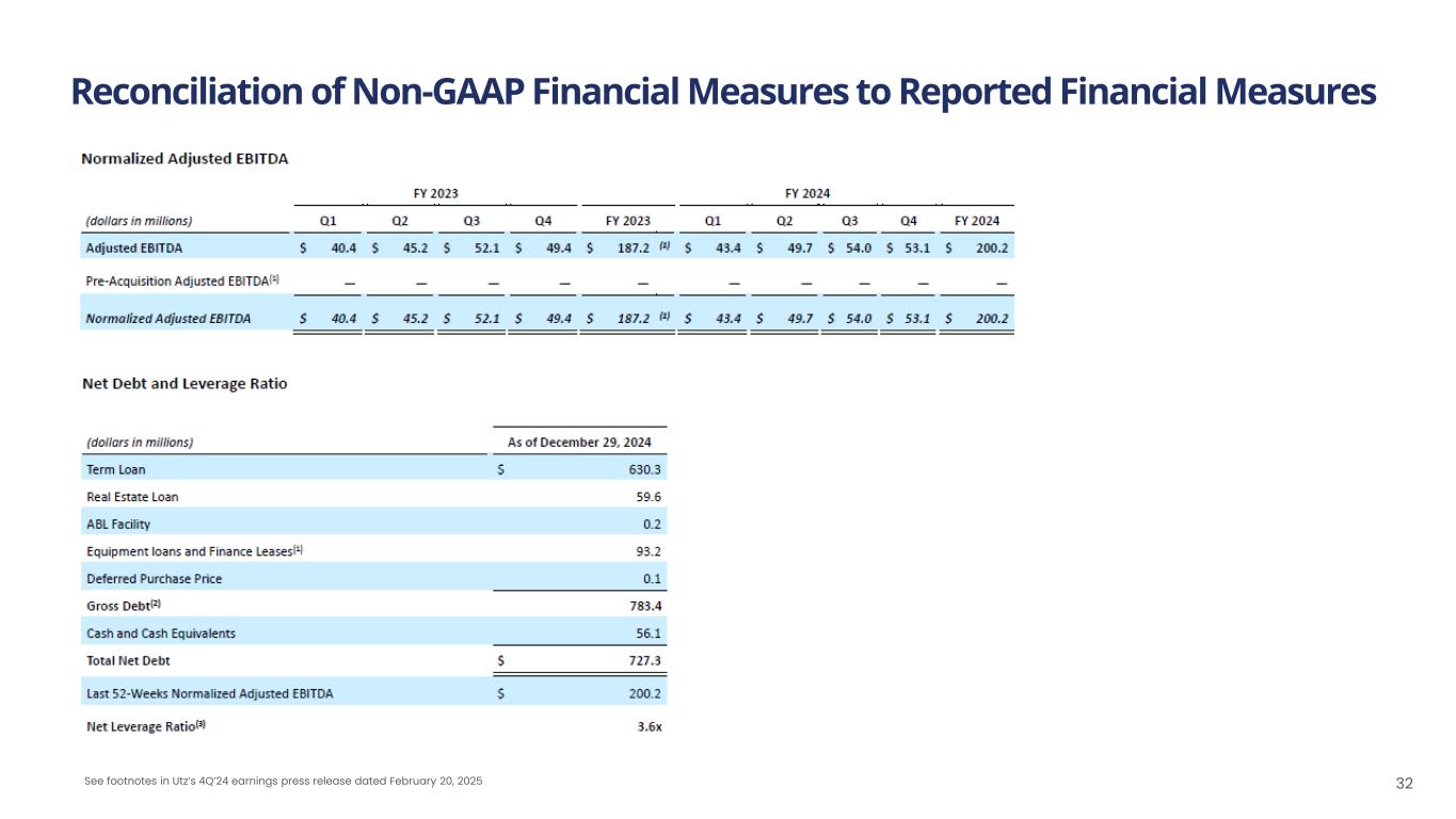 Reconciliation of Non-GAAP Financial Measures to Reported Financial Measures 31See footnotes in Utz’s 4Q’24 earnings press release dated February 20, 2025