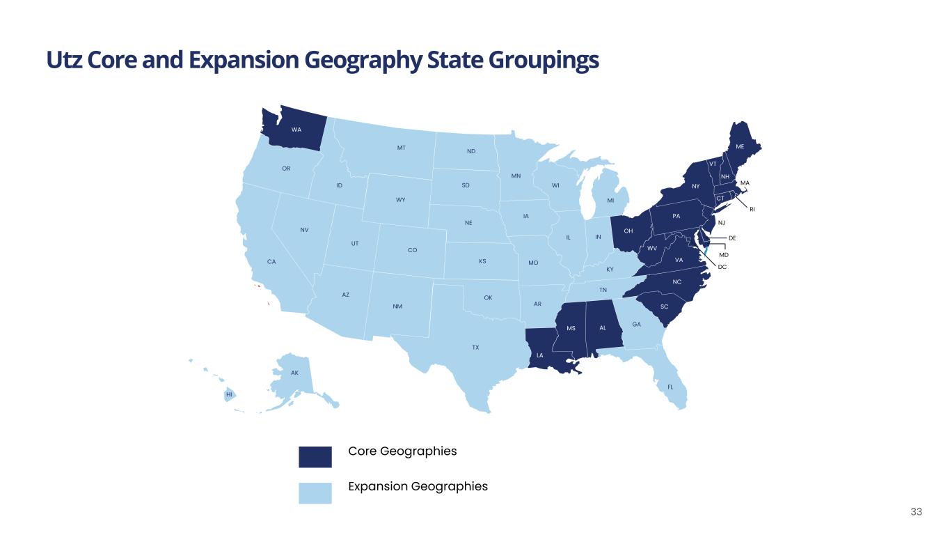 Utz Core and Expansion Geography State Groupings 33 FL NM DE MD TX OK KS NE SD NDMT WY CO UT ID AZ NV WA CA OR KY ME NY PA VT NH MA RI CT WV INIL NC TN SC ALMS AR LA MO IA MN WI NJ GA DC VA OH MI HI AK Core Geographies Expansion Geographies