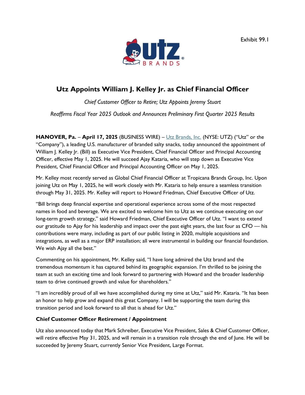 Exhibit 99.1 Utz Appoints William J. Kelley Jr. as Chief Financial Officer Chief Customer Officer to Retire; Utz Appoints Jeremy Stuart Reaffirms Fiscal Year 2025 Outlook and Announces Preliminary First Quarter 2025 Results HANOVER, Pa. – April 17, 2025 (BUSINESS WIRE) – Utz Brands, Inc. (NYSE: UTZ) (“Utz” or the “Company”), a leading U.S. manufacturer of branded salty snacks, today announced the appointment of William J. Kelley Jr. (Bill) as Executive Vice President, Chief Financial Officer and Principal Accounting Officer, effective May 1, 2025. He will succeed Ajay Kataria, who will step down as Executive Vice President, Chief Financial Officer and Principal Accounting Officer on May 1, 2025. Mr. Kelley most recently served as Global Chief Financial Officer at Tropicana Brands Group, Inc. Upon joining Utz on May 1, 2025, he will work closely with Mr. Kataria to help ensure a seamless transition through May 31, 2025. Mr. Kelley will report to Howard Friedman, Chief Executive Officer of Utz. “Bill brings deep financial expertise and operational experience across some of the most respected names in food and beverage. We are excited to welcome him to Utz as we continue executing on our long-term growth strategy,” said Howard Friedman, Chief Executive Officer of Utz. “I want to extend our gratitude to Ajay for his leadership and impact over the past eight years, the last four as CFO — his contributions were many, including as part of our public listing in 2020, multiple acquisitions and integrations, as well as a major ERP installation; all were instrumental in building our financial foundation. We wish Ajay all the best.” Commenting on his appointment, Mr. Kelley said, “I have long admired the Utz brand and the tremendous momentum it has captured behind its geographic expansion. I’m thrilled to be joining the team at such an exciting time and look forward to partnering with Howard and the broader leadership team to drive continued growth and value for shareholders.” “I am incredibly proud of all we have accomplished during my time at Utz,” said Mr. Kataria. “It has been an honor to help grow and expand this great Company. I will be supporting the team during this transition period and look forward to all that is ahead for Utz.” Chief Customer Officer Retirement / Appointment Utz also announced today that Mark Schreiber, Executive Vice President, Sales & Chief Customer Officer, will retire effective May 31, 2025, and will remain in a transition role through the end of June. He will be succeeded by Jeremy Stuart, currently Senior Vice President, Large Format.