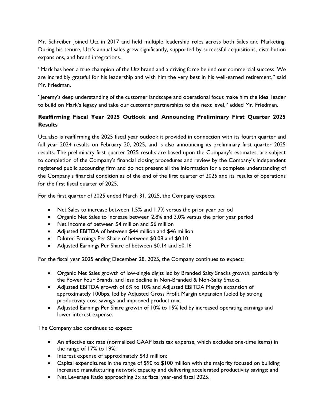 Mr. Schreiber joined Utz in 2017 and held multiple leadership roles across both Sales and Marketing. During his tenure, Utz’s annual sales grew significantly, supported by successful acquisitions, distribution expansions, and brand integrations. “Mark has been a true champion of the Utz brand and a driving force behind our commercial success. We are incredibly grateful for his leadership and wish him the very best in his well-earned retirement,” said Mr. Friedman. “Jeremy’s deep understanding of the customer landscape and operational focus make him the ideal leader to build on Mark’s legacy and take our customer partnerships to the next level,” added Mr. Friedman. Reaffirming Fiscal Year 2025 Outlook and Announcing Preliminary First Quarter 2025 Results Utz also is reaffirming the 2025 fiscal year outlook it provided in connection with its fourth quarter and full year 2024 results on February 20, 2025, and is also announcing its preliminary first quarter 2025 results. The preliminary first quarter 2025 results are based upon the Company’s estimates, are subject to completion of the Company’s financial closing procedures and review by the Company’s independent registered public accounting firm and do not present all the information for a complete understanding of the Company’s financial condition as of the end of the first quarter of 2025 and its results of operations for the first fiscal quarter of 2025. For the first quarter of 2025 ended March 31, 2025, the Company expects: • Net Sales to increase between 1.5% and 1.7% versus the prior year period • Organic Net Sales to increase between 2.8% and 3.0% versus the prior year period • Net Income of between $4 million and $6 million • Adjusted EBITDA of between $44 million and $46 million • Diluted Earnings Per Share of between $0.08 and $0.10 • Adjusted Earnings Per Share of between $0.14 and $0.16 For the fiscal year 2025 ending December 28, 2025, the Company continues to expect: • Organic Net Sales growth of low-single digits led by Branded Salty Snacks growth, particularly the Power Four Brands, and less decline in Non-Branded & Non-Salty Snacks. • Adjusted EBITDA growth of 6% to 10% and Adjusted EBITDA Margin expansion of approximately 100bps, led by Adjusted Gross Profit Margin expansion fueled by strong productivity cost savings and improved product mix. • Adjusted Earnings Per Share growth of 10% to 15% led by increased operating earnings and lower interest expense. The Company also continues to expect: • An effective tax rate (normalized GAAP basis tax expense, which excludes one-time items) in the range of 17% to 19%; • Interest expense of approximately $43 million; • Capital expenditures in the range of $90 to $100 million with the majority focused on building increased manufacturing network capacity and delivering accelerated productivity savings; and • Net Leverage Ratio approaching 3x at fiscal year-end fiscal 2025.