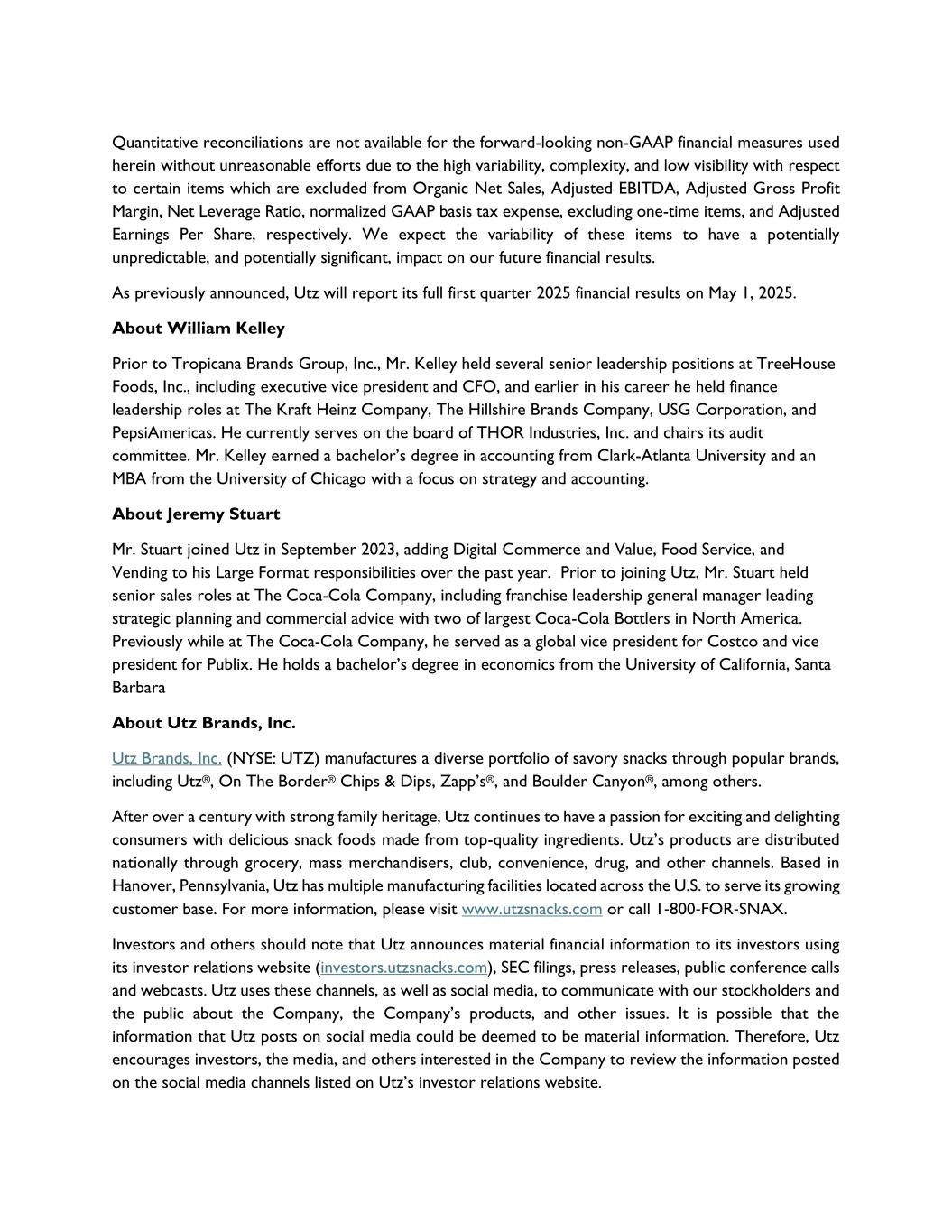 Quantitative reconciliations are not available for the forward-looking non-GAAP financial measures used herein without unreasonable efforts due to the high variability, complexity, and low visibility with respect to certain items which are excluded from Organic Net Sales, Adjusted EBITDA, Adjusted Gross Profit Margin, Net Leverage Ratio, normalized GAAP basis tax expense, excluding one-time items, and Adjusted Earnings Per Share, respectively. We expect the variability of these items to have a potentially unpredictable, and potentially significant, impact on our future financial results. As previously announced, Utz will report its full first quarter 2025 financial results on May 1, 2025. About William Kelley Prior to Tropicana Brands Group, Inc., Mr. Kelley held several senior leadership positions at TreeHouse Foods, Inc., including executive vice president and CFO, and earlier in his career he held finance leadership roles at The Kraft Heinz Company, The Hillshire Brands Company, USG Corporation, and PepsiAmericas. He currently serves on the board of THOR Industries, Inc. and chairs its audit committee. Mr. Kelley earned a bachelor’s degree in accounting from Clark-Atlanta University and an MBA from the University of Chicago with a focus on strategy and accounting. About Jeremy Stuart Mr. Stuart joined Utz in September 2023, adding Digital Commerce and Value, Food Service, and Vending to his Large Format responsibilities over the past year. Prior to joining Utz, Mr. Stuart held senior sales roles at The Coca-Cola Company, including franchise leadership general manager leading strategic planning and commercial advice with two of largest Coca-Cola Bottlers in North America. Previously while at The Coca-Cola Company, he served as a global vice president for Costco and vice president for Publix. He holds a bachelor’s degree in economics from the University of California, Santa Barbara About Utz Brands, Inc. Utz Brands, Inc. (NYSE: UTZ) manufactures a diverse portfolio of savory snacks through popular brands, including Utz®, On The Border® Chips & Dips, Zapp’s®, and Boulder Canyon®, among others. After over a century with strong family heritage, Utz continues to have a passion for exciting and delighting consumers with delicious snack foods made from top-quality ingredients. Utz’s products are distributed nationally through grocery, mass merchandisers, club, convenience, drug, and other channels. Based in Hanover, Pennsylvania, Utz has multiple manufacturing facilities located across the U.S. to serve its growing customer base. For more information, please visit www.utzsnacks.com or call 1‐800‐FOR‐SNAX. Investors and others should note that Utz announces material financial information to its investors using its investor relations website (investors.utzsnacks.com), SEC filings, press releases, public conference calls and webcasts. Utz uses these channels, as well as social media, to communicate with our stockholders and the public about the Company, the Company’s products, and other issues. It is possible that the information that Utz posts on social media could be deemed to be material information. Therefore, Utz encourages investors, the media, and others interested in the Company to review the information posted on the social media channels listed on Utz’s investor relations website.