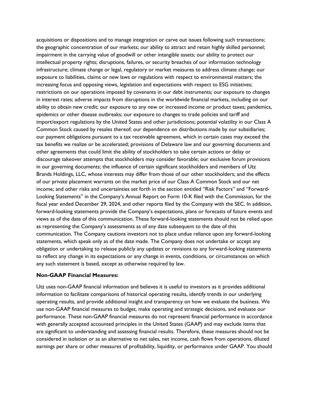 acquisitions or dispositions and to manage integration or carve out issues following such transactions; the geographic concentration of our markets; our ability to attract and retain highly skilled personnel; impairment in the carrying value of goodwill or other intangible assets; our ability to protect our intellectual property rights; disruptions, failures, or security breaches of our information technology infrastructure; climate change or legal, regulatory or market measures to address climate change; our exposure to liabilities, claims or new laws or regulations with respect to environmental matters; the increasing focus and opposing views, legislation and expectations with respect to ESG initiatives; restrictions on our operations imposed by covenants in our debt instruments; our exposure to changes in interest rates; adverse impacts from disruptions in the worldwide financial markets, including on our ability to obtain new credit; our exposure to any new or increased income or product taxes; pandemics, epidemics or other disease outbreaks; our exposure to changes to trade policies and tariff and import/export regulations by the United States and other jurisdictions; potential volatility in our Class A Common Stock caused by resales thereof; our dependence on distributions made by our subsidiaries; our payment obligations pursuant to a tax receivable agreement, which in certain cases may exceed the tax benefits we realize or be accelerated; provisions of Delaware law and our governing documents and other agreements that could limit the ability of stockholders to take certain actions or delay or discourage takeover attempts that stockholders may consider favorable; our exclusive forum provisions in our governing documents; the influence of certain significant stockholders and members of Utz Brands Holdings, LLC, whose interests may differ from those of our other stockholders; and the effects of our private placement warrants on the market price of our Class A Common Stock and our net income; and other risks and uncertainties set forth in the section entitled “Risk Factors” and “Forward- Looking Statements” in the Company’s Annual Report on Form 10-K filed with the Commission, for the fiscal year ended December 29, 2024, and other reports filed by the Company with the SEC. In addition, forward-looking statements provide the Company’s expectations, plans or forecasts of future events and views as of the date of this communication. These forward-looking statements should not be relied upon as representing the Company’s assessments as of any date subsequent to the date of this communication. The Company cautions investors not to place undue reliance upon any forward-looking statements, which speak only as of the date made. The Company does not undertake or accept any obligation or undertaking to release publicly any updates or revisions to any forward-looking statements to reflect any change in its expectations or any change in events, conditions, or circumstances on which any such statement is based, except as otherwise required by law. Non-GAAP Financial Measures: Utz uses non-GAAP financial information and believes it is useful to investors as it provides additional information to facilitate comparisons of historical operating results, identify trends in our underlying operating results, and provide additional insight and transparency on how we evaluate the business. We use non-GAAP financial measures to budget, make operating and strategic decisions, and evaluate our performance. These non-GAAP financial measures do not represent financial performance in accordance with generally accepted accounted principles in the United States (GAAP) and may exclude items that are significant to understanding and assessing financial results. Therefore, these measures should not be considered in isolation or as an alternative to net sales, net income, cash flows from operations, diluted earnings per share or other measures of profitability, liquidity, or performance under GAAP. You should