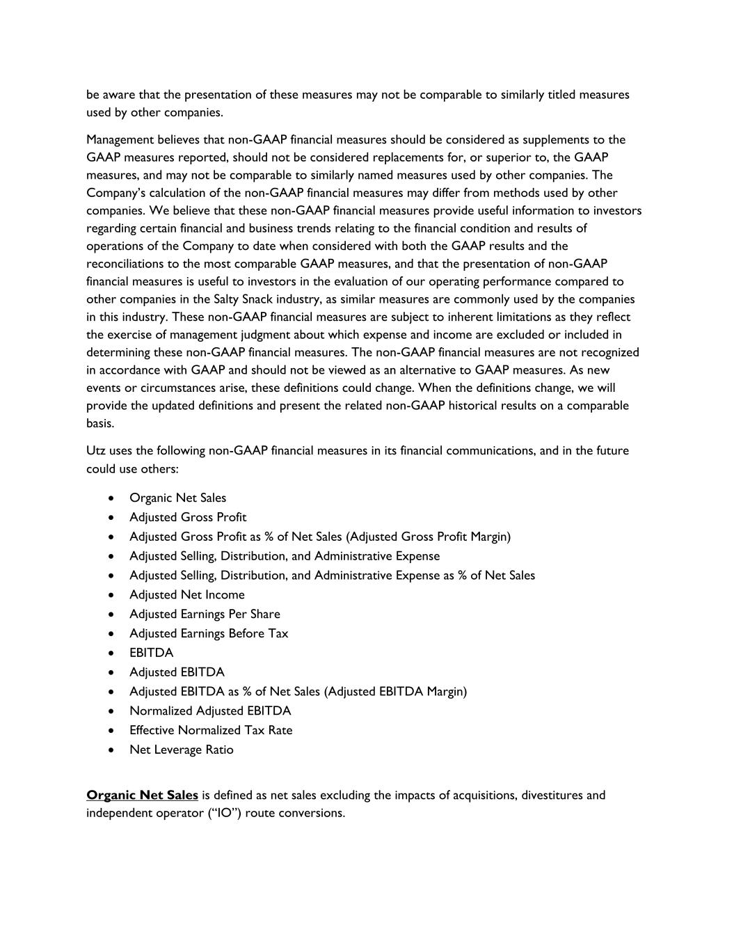 be aware that the presentation of these measures may not be comparable to similarly titled measures used by other companies. Management believes that non-GAAP financial measures should be considered as supplements to the GAAP measures reported, should not be considered replacements for, or superior to, the GAAP measures, and may not be comparable to similarly named measures used by other companies. The Company’s calculation of the non-GAAP financial measures may differ from methods used by other companies. We believe that these non-GAAP financial measures provide useful information to investors regarding certain financial and business trends relating to the financial condition and results of operations of the Company to date when considered with both the GAAP results and the reconciliations to the most comparable GAAP measures, and that the presentation of non-GAAP financial measures is useful to investors in the evaluation of our operating performance compared to other companies in the Salty Snack industry, as similar measures are commonly used by the companies in this industry. These non-GAAP financial measures are subject to inherent limitations as they reflect the exercise of management judgment about which expense and income are excluded or included in determining these non-GAAP financial measures. The non-GAAP financial measures are not recognized in accordance with GAAP and should not be viewed as an alternative to GAAP measures. As new events or circumstances arise, these definitions could change. When the definitions change, we will provide the updated definitions and present the related non-GAAP historical results on a comparable basis. Utz uses the following non-GAAP financial measures in its financial communications, and in the future could use others: • Organic Net Sales • Adjusted Gross Profit • Adjusted Gross Profit as % of Net Sales (Adjusted Gross Profit Margin) • Adjusted Selling, Distribution, and Administrative Expense • Adjusted Selling, Distribution, and Administrative Expense as % of Net Sales • Adjusted Net Income • Adjusted Earnings Per Share • Adjusted Earnings Before Tax • EBITDA • Adjusted EBITDA • Adjusted EBITDA as % of Net Sales (Adjusted EBITDA Margin) • Normalized Adjusted EBITDA • Effective Normalized Tax Rate • Net Leverage Ratio Organic Net Sales is defined as net sales excluding the impacts of acquisitions, divestitures and independent operator (“IO”) route conversions.