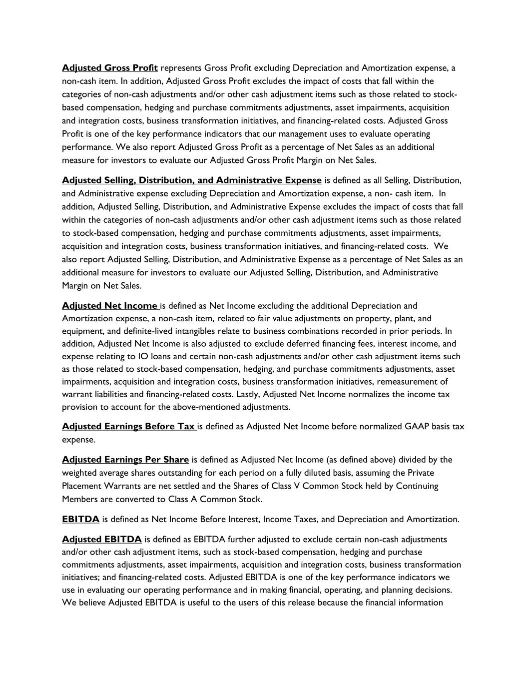Adjusted Gross Profit represents Gross Profit excluding Depreciation and Amortization expense, a non-cash item. In addition, Adjusted Gross Profit excludes the impact of costs that fall within the categories of non-cash adjustments and/or other cash adjustment items such as those related to stock- based compensation, hedging and purchase commitments adjustments, asset impairments, acquisition and integration costs, business transformation initiatives, and financing-related costs. Adjusted Gross Profit is one of the key performance indicators that our management uses to evaluate operating performance. We also report Adjusted Gross Profit as a percentage of Net Sales as an additional measure for investors to evaluate our Adjusted Gross Profit Margin on Net Sales. Adjusted Selling, Distribution, and Administrative Expense is defined as all Selling, Distribution, and Administrative expense excluding Depreciation and Amortization expense, a non- cash item. In addition, Adjusted Selling, Distribution, and Administrative Expense excludes the impact of costs that fall within the categories of non-cash adjustments and/or other cash adjustment items such as those related to stock-based compensation, hedging and purchase commitments adjustments, asset impairments, acquisition and integration costs, business transformation initiatives, and financing-related costs. We also report Adjusted Selling, Distribution, and Administrative Expense as a percentage of Net Sales as an additional measure for investors to evaluate our Adjusted Selling, Distribution, and Administrative Margin on Net Sales. Adjusted Net Income is defined as Net Income excluding the additional Depreciation and Amortization expense, a non-cash item, related to fair value adjustments on property, plant, and equipment, and definite-lived intangibles relate to business combinations recorded in prior periods. In addition, Adjusted Net Income is also adjusted to exclude deferred financing fees, interest income, and expense relating to IO loans and certain non-cash adjustments and/or other cash adjustment items such as those related to stock-based compensation, hedging, and purchase commitments adjustments, asset impairments, acquisition and integration costs, business transformation initiatives, remeasurement of warrant liabilities and financing-related costs. Lastly, Adjusted Net Income normalizes the income tax provision to account for the above-mentioned adjustments. Adjusted Earnings Before Tax is defined as Adjusted Net Income before normalized GAAP basis tax expense. Adjusted Earnings Per Share is defined as Adjusted Net Income (as defined above) divided by the weighted average shares outstanding for each period on a fully diluted basis, assuming the Private Placement Warrants are net settled and the Shares of Class V Common Stock held by Continuing Members are converted to Class A Common Stock. EBITDA is defined as Net Income Before Interest, Income Taxes, and Depreciation and Amortization. Adjusted EBITDA is defined as EBITDA further adjusted to exclude certain non-cash adjustments and/or other cash adjustment items, such as stock-based compensation, hedging and purchase commitments adjustments, asset impairments, acquisition and integration costs, business transformation initiatives; and financing-related costs. Adjusted EBITDA is one of the key performance indicators we use in evaluating our operating performance and in making financial, operating, and planning decisions. We believe Adjusted EBITDA is useful to the users of this release because the financial information