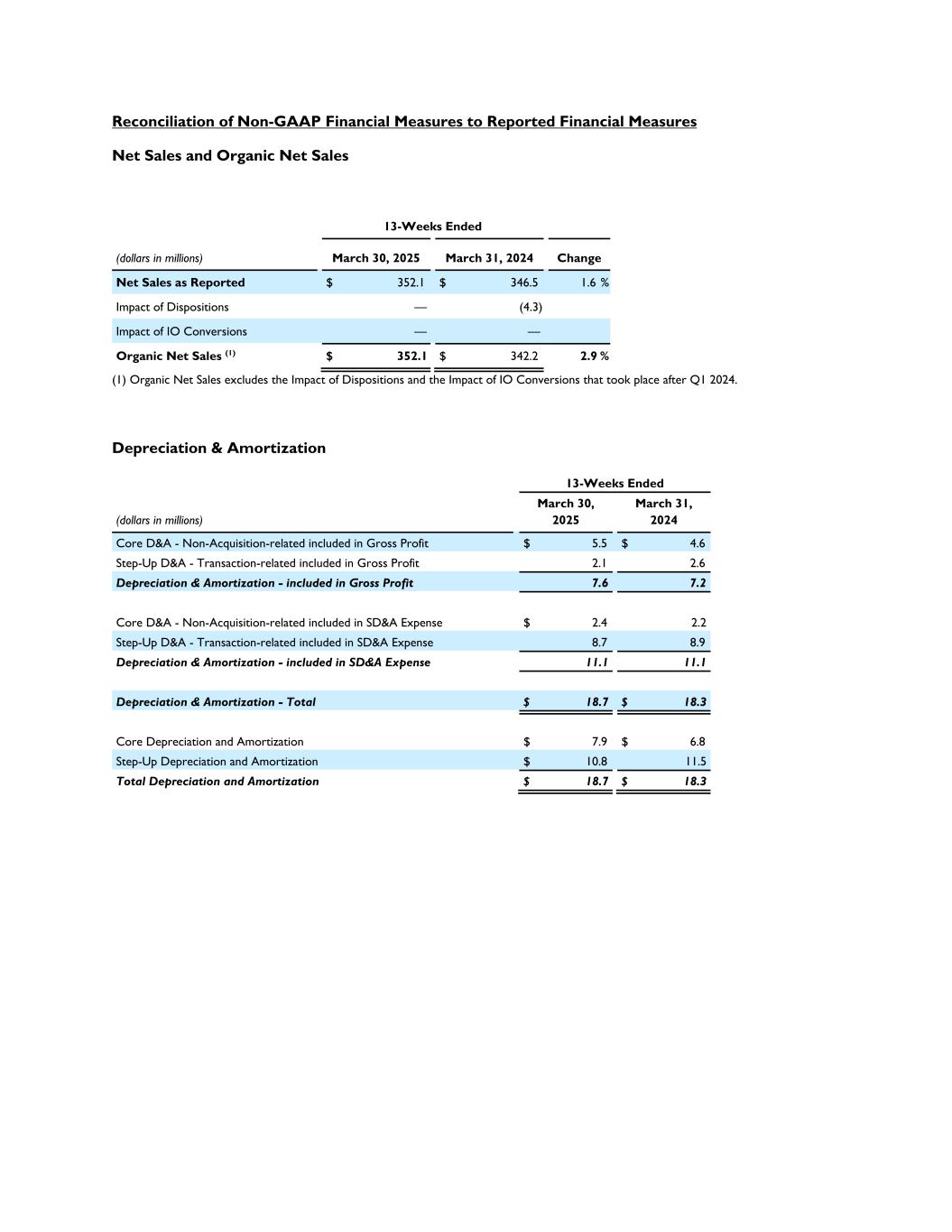 Reconciliation of Non-GAAP Financial Measures to Reported Financial Measures Net Sales and Organic Net Sales 13-Weeks Ended (dollars in millions) March 30, 2025 March 31, 2024 Change Net Sales as Reported $ 352.1 $ 346.5 1.6 % Impact of Dispositions — (4.3) Impact of IO Conversions — — Organic Net Sales (1) $ 352.1 $ 342.2 2.9 % (1) Organic Net Sales excludes the Impact of Dispositions and the Impact of IO Conversions that took place after Q1 2024. Depreciation & Amortization 13-Weeks Ended (dollars in millions) March 30, 2025 March 31, 2024 Core D&A - Non-Acquisition-related included in Gross Profit $ 5.5 $ 4.6 Step-Up D&A - Transaction-related included in Gross Profit 2.1 2.6 Depreciation & Amortization - included in Gross Profit 7.6 7.2 Core D&A - Non-Acquisition-related included in SD&A Expense $ 2.4 2.2 Step-Up D&A - Transaction-related included in SD&A Expense 8.7 8.9 Depreciation & Amortization - included in SD&A Expense 11.1 11.1 Depreciation & Amortization - Total $ 18.7 $ 18.3 Core Depreciation and Amortization $ 7.9 $ 6.8 Step-Up Depreciation and Amortization $ 10.8 11.5 Total Depreciation and Amortization $ 18.7 $ 18.3