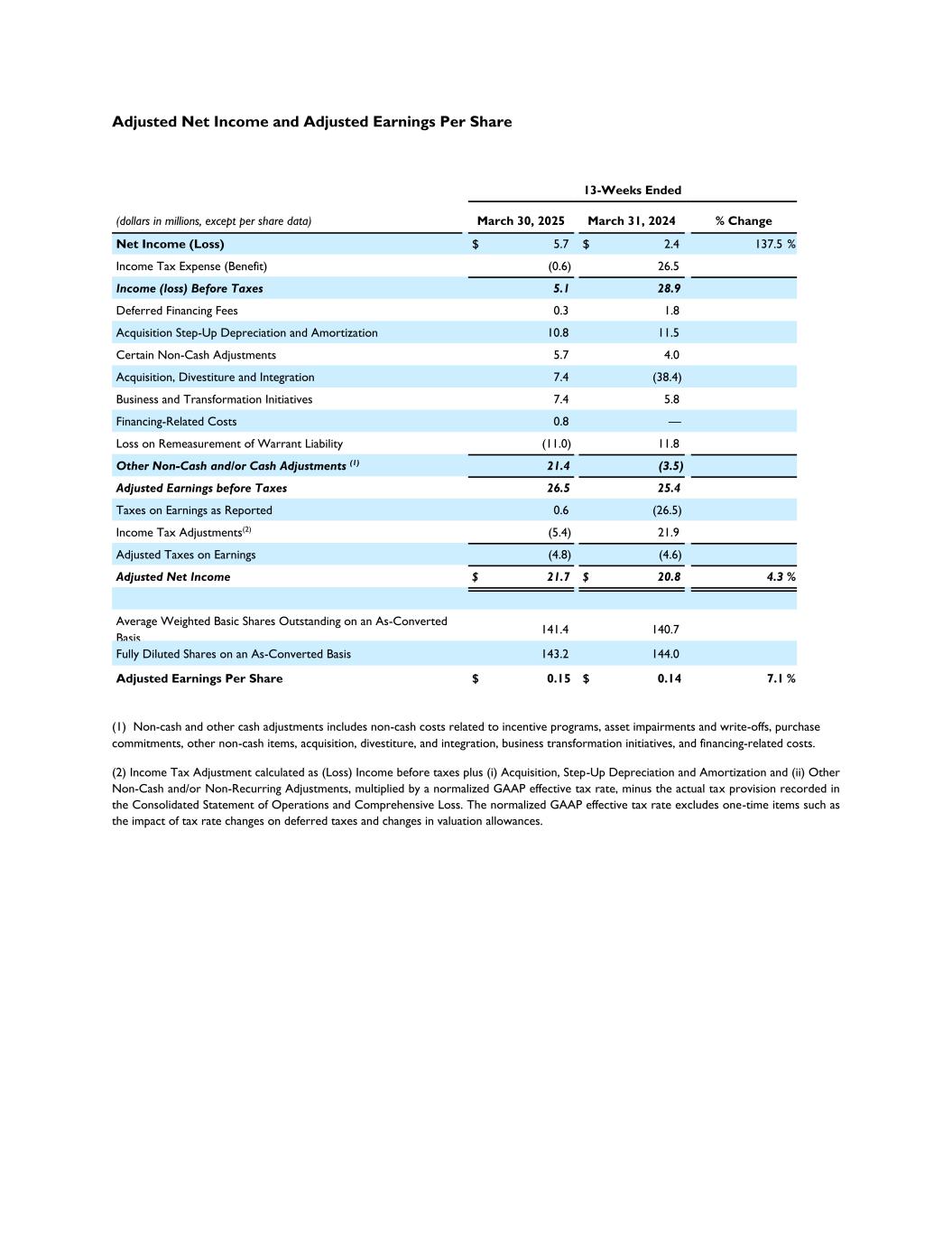 Adjusted Net Income and Adjusted Earnings Per Share 13-Weeks Ended (dollars in millions, except per share data) March 30, 2025 March 31, 2024 % Change Net Income (Loss) $ 5.7 $ 2.4 137.5 % Income Tax Expense (Benefit) (0.6) 26.5 Income (loss) Before Taxes 5.1 28.9 Deferred Financing Fees 0.3 1.8 Acquisition Step-Up Depreciation and Amortization 10.8 11.5 Certain Non-Cash Adjustments 5.7 4.0 Acquisition, Divestiture and Integration 7.4 (38.4) Business and Transformation Initiatives 7.4 5.8 Financing-Related Costs 0.8 — Loss on Remeasurement of Warrant Liability (11.0) 11.8 Other Non-Cash and/or Cash Adjustments (1) 21.4 (3.5) Adjusted Earnings before Taxes 26.5 25.4 Taxes on Earnings as Reported 0.6 (26.5) Income Tax Adjustments(2) (5.4) 21.9 Adjusted Taxes on Earnings (4.8) (4.6) Adjusted Net Income $ 21.7 $ 20.8 4.3 % Average Weighted Basic Shares Outstanding on an As-Converted Basis 141.4 140.7 Fully Diluted Shares on an As-Converted Basis 143.2 144.0 Adjusted Earnings Per Share $ 0.15 $ 0.14 7.1 % (1) Non-cash and other cash adjustments includes non-cash costs related to incentive programs, asset impairments and write-offs, purchase commitments, other non-cash items, acquisition, divestiture, and integration, business transformation initiatives, and financing-related costs. (2) Income Tax Adjustment calculated as (Loss) Income before taxes plus (i) Acquisition, Step-Up Depreciation and Amortization and (ii) Other Non-Cash and/or Non-Recurring Adjustments, multiplied by a normalized GAAP effective tax rate, minus the actual tax provision recorded in the Consolidated Statement of Operations and Comprehensive Loss. The normalized GAAP effective tax rate excludes one-time items such as the impact of tax rate changes on deferred taxes and changes in valuation allowances.
