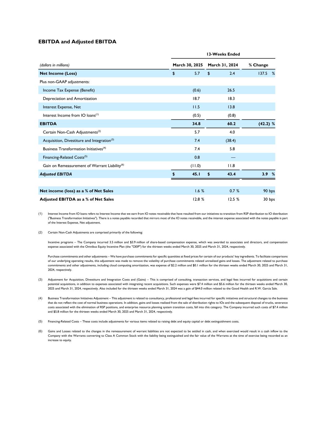 EBITDA and Adjusted EBITDA 13-Weeks Ended (dollars in millions) March 30, 2025 March 31, 2024 % Change Net Income (Loss) $ 5.7 $ 2.4 137.5 % Plus non-GAAP adjustments: Income Tax Expense (Benefit) (0.6) 26.5 Depreciation and Amortization 18.7 18.3 Interest Expense, Net 11.5 13.8 Interest Income from IO loans(1) (0.5) (0.8) EBITDA 34.8 60.2 (42.2) % Certain Non-Cash Adjustments(2) 5.7 4.0 Acquisition, Divestiture and Integration(3) 7.4 (38.4) Business Transformation Initiatives(4) 7.4 5.8 Financing-Related Costs(5) 0.8 — Gain on Remeasurement of Warrant Liability(6) (11.0) 11.8 Adjusted EBITDA $ 45.1 $ 43.4 3.9 % Net income (loss) as a % of Net Sales 1.6 % 0.7 % 90 bps Adjusted EBITDA as a % of Net Sales 12.8 % 12.5 % 30 bps (1) Interest Income from IO loans refers to Interest Income that we earn from IO notes receivable that have resulted from our initiatives to transition from RSP distribution to IO distribution ("Business Transformation Initiatives"). There is a notes payable recorded that mirrors most of the IO notes receivable, and the interest expense associated with the notes payable is part of the Interest Expense, Net adjustment. (2) Certain Non-Cash Adjustments are comprised primarily of the following: Incentive programs – The Company incurred 3.5 million and $3.9 million of share-based compensation expense, which was awarded to associates and directors, and compensation expense associated with the Omnibus Equity Incentive Plan (the "OEIP") for the thirteen weeks ended March 30, 2025 and March 31, 2024, respectively. Purchase commitments and other adjustments – We have purchase commitments for specific quantities at fixed prices for certain of our products’ key ingredients. To facilitate comparisons of our underlying operating results, this adjustment was made to remove the volatility of purchase commitments related unrealized gains and losses. The adjustment related to purchase commitments and other adjustments, including cloud computing amortization, was expense of $2.2 million and $0.1 million for the thirteen weeks ended March 30, 2025 and March 31, 2024, respectively. (3) Adjustment for Acquisition, Divestiture and Integration Costs and (Gains) – This is comprised of consulting, transaction services, and legal fees incurred for acquisitions and certain potential acquisitions, in addition to expenses associated with integrating recent acquisitions. Such expenses were $7.4 million and $5.6 million for the thirteen weeks ended March 30, 2025 and March 31, 2024, respectively. Also included for the thirteen weeks ended March 31, 2024 was a gain of $44.0 million related to the Good Health and R.W. Garcia Sale. (4) Business Transformation Initiatives Adjustment – This adjustment is related to consultancy, professional and legal fees incurred for specific initiatives and structural changes to the business that do not reflect the cost of normal business operations. In addition, gains and losses realized from the sale of distribution rights to IOs and the subsequent disposal of trucks, severance costs associated with the elimination of RSP positions, and enterprise resource planning system transition costs, fall into this category. The Company incurred such costs of $7.4 million and $5.8 million for the thirteen weeks ended March 30, 2025 and March 31, 2024, respectively. (5) Financing-Related Costs – These costs include adjustments for various items related to raising debt and equity capital or debt extinguishment costs. (6) Gains and Losses related to the changes in the remeasurement of warrant liabilities are not expected to be settled in cash, and when exercised would result in a cash inflow to the Company with the Warrants converting to Class A Common Stock with the liability being extinguished and the fair value of the Warrants at the time of exercise being recorded as an increase to equity.
