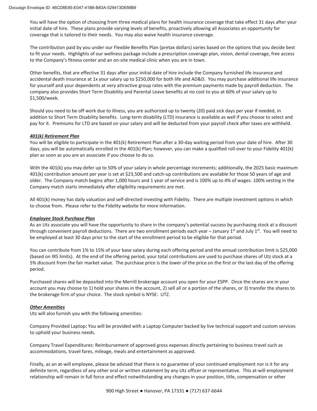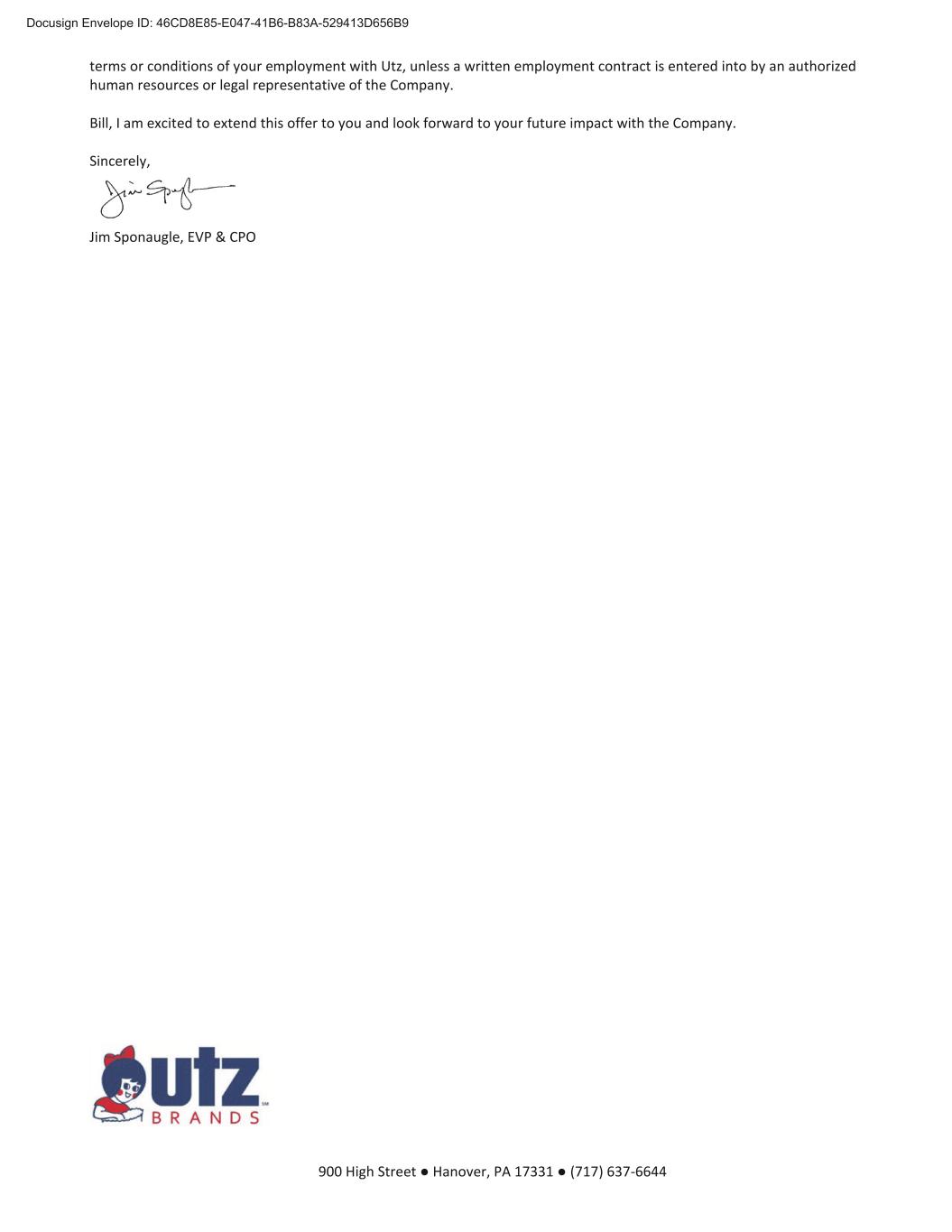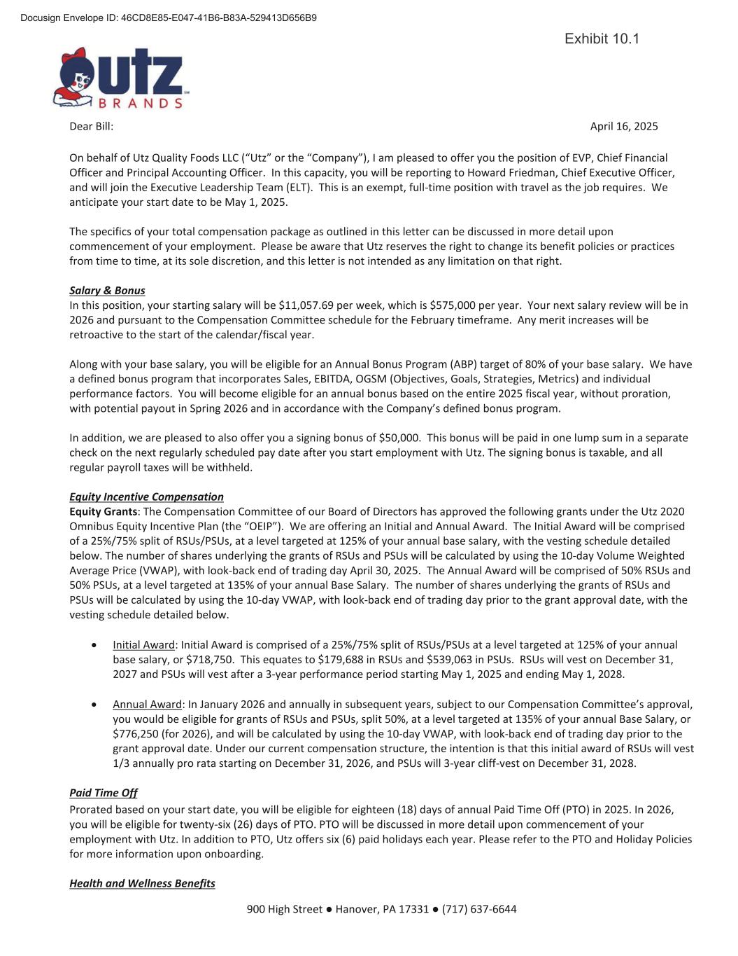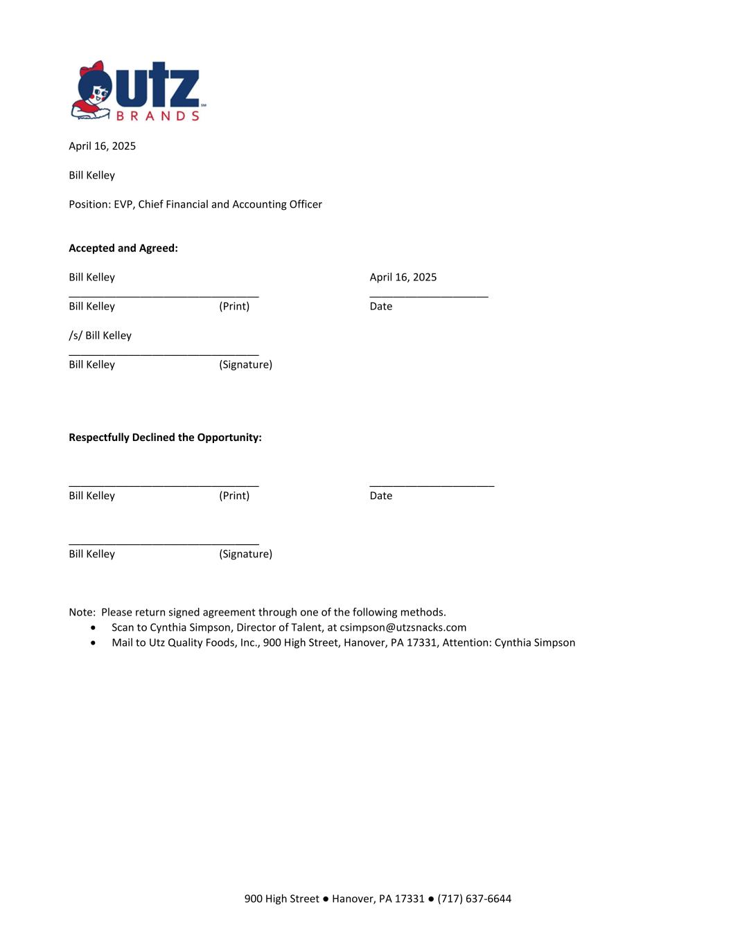 900 High Street ● Hanover, PA 17331 ● (717) 637-6644 April 16, 2025 Bill Kelley Position: EVP, Chief Financial and Accounting Officer Accepted and Agreed: Bill Kelley April 16, 2025 ________________________________ ____________________ Bill Kelley (Print) Date /s/ Bill Kelley ________________________________ Bill Kelley (Signature) Respectfully Declined the Opportunity: ________________________________ _____________________ Bill Kelley (Print) Date ________________________________ Bill Kelley (Signature) Note: Please return signed agreement through one of the following methods.  Scan to Cynthia Simpson, Director of Talent, at csimpson@utzsnacks.com  Mail to Utz Quality Foods, Inc., 900 High Street, Hanover, PA 17331, Attention: Cynthia Simpson