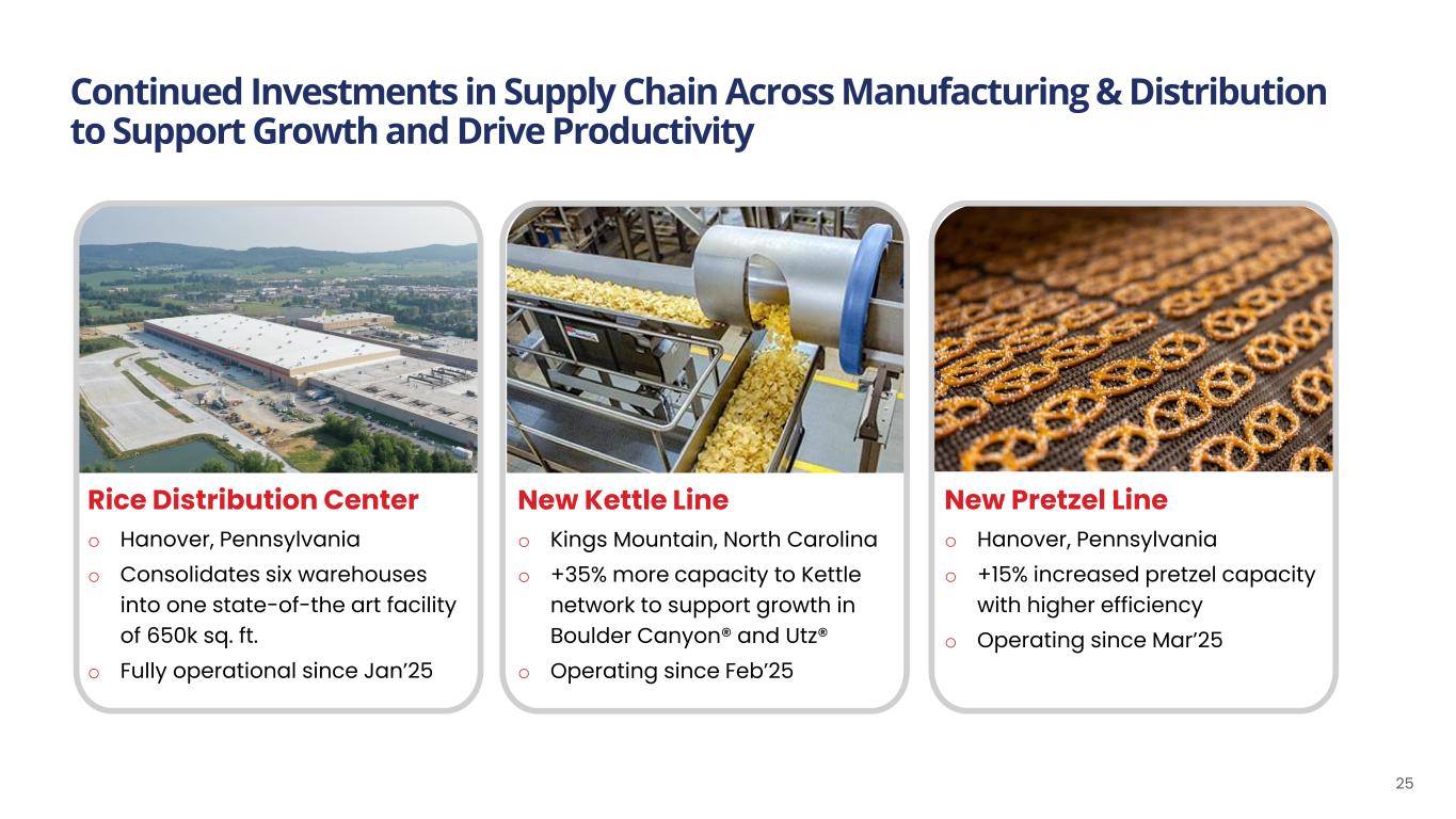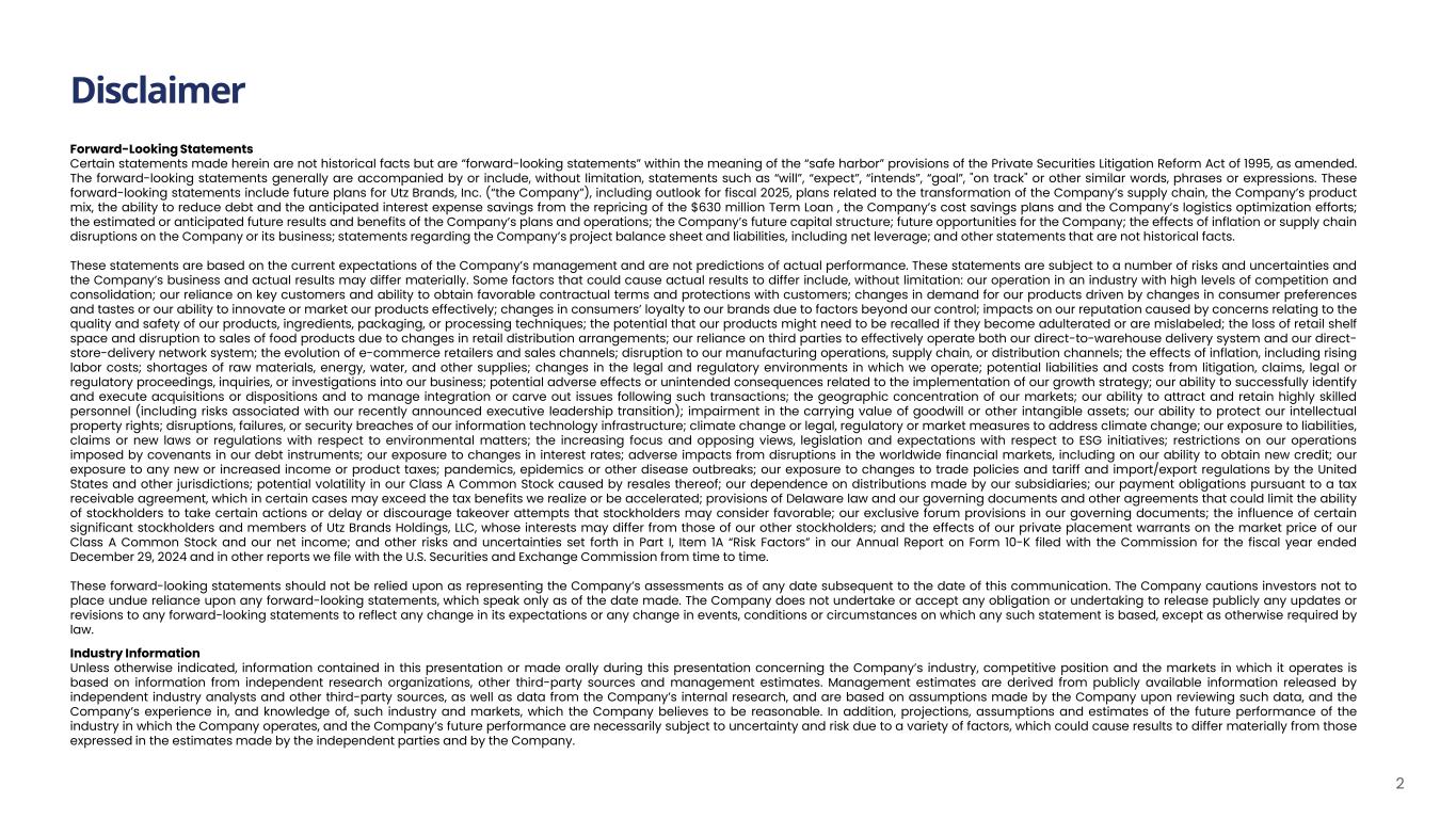 Disclaimer 2 Forward-Looking Statements Certain statements made herein are not historical facts but are “forward-looking statements” within the meaning of the “safe harbor” provisions of the Private Securities Litigation Reform Act of 1995, as amended. The forward-looking statements generally are accompanied by or include, without limitation, statements such as “will”, “expect”, “intends”, “goal”, "on track" or other similar words, phrases or expressions. These forward-looking statements include future plans for Utz Brands, Inc. (“the Company”), including outlook for fiscal 2025, plans related to the transformation of the Company’s supply chain, the Company’s product mix, the ability to reduce debt and the anticipated interest expense savings from the repricing of the $630 million Term Loan , the Company’s cost savings plans and the Company’s logistics optimization efforts; the estimated or anticipated future results and benefits of the Company’s plans and operations; the Company’s future capital structure; future opportunities for the Company; the effects of inflation or supply chain disruptions on the Company or its business; statements regarding the Company’s project balance sheet and liabilities, including net leverage; and other statements that are not historical facts. These statements are based on the current expectations of the Company’s management and are not predictions of actual performance. These statements are subject to a number of risks and uncertainties and the Company’s business and actual results may differ materially. Some factors that could cause actual results to differ include, without limitation: our operation in an industry with high levels of competition and consolidation; our reliance on key customers and ability to obtain favorable contractual terms and protections with customers; changes in demand for our products driven by changes in consumer preferences and tastes or our ability to innovate or market our products effectively; changes in consumers’ loyalty to our brands due to factors beyond our control; impacts on our reputation caused by concerns relating to the quality and safety of our products, ingredients, packaging, or processing techniques; the potential that our products might need to be recalled if they become adulterated or are mislabeled; the loss of retail shelf space and disruption to sales of food products due to changes in retail distribution arrangements; our reliance on third parties to effectively operate both our direct-to-warehouse delivery system and our direct- store-delivery network system; the evolution of e-commerce retailers and sales channels; disruption to our manufacturing operations, supply chain, or distribution channels; the effects of inflation, including rising labor costs; shortages of raw materials, energy, water, and other supplies; changes in the legal and regulatory environments in which we operate; potential liabilities and costs from litigation, claims, legal or regulatory proceedings, inquiries, or investigations into our business; potential adverse effects or unintended consequences related to the implementation of our growth strategy; our ability to successfully identify and execute acquisitions or dispositions and to manage integration or carve out issues following such transactions; the geographic concentration of our markets; our ability to attract and retain highly skilled personnel (including risks associated with our recently announced executive leadership transition); impairment in the carrying value of goodwill or other intangible assets; our ability to protect our intellectual property rights; disruptions, failures, or security breaches of our information technology infrastructure; climate change or legal, regulatory or market measures to address climate change; our exposure to liabilities, claims or new laws or regulations with respect to environmental matters; the increasing focus and opposing views, legislation and expectations with respect to ESG initiatives; restrictions on our operations imposed by covenants in our debt instruments; our exposure to changes in interest rates; adverse impacts from disruptions in the worldwide financial markets, including on our ability to obtain new credit; our exposure to any new or increased income or product taxes; pandemics, epidemics or other disease outbreaks; our exposure to changes to trade policies and tariff and import/export regulations by the United States and other jurisdictions; potential volatility in our Class A Common Stock caused by resales thereof; our dependence on distributions made by our subsidiaries; our payment obligations pursuant to a tax receivable agreement, which in certain cases may exceed the tax benefits we realize or be accelerated; provisions of Delaware law and our governing documents and other agreements that could limit the ability of stockholders to take certain actions or delay or discourage takeover attempts that stockholders may consider favorable; our exclusive forum provisions in our governing documents; the influence of certain significant stockholders and members of Utz Brands Holdings, LLC, whose interests may differ from those of our other stockholders; and the effects of our private placement warrants on the market price of our Class A Common Stock and our net income; and other risks and uncertainties set forth in Part I, Item 1A “Risk Factors” in our Annual Report on Form 10-K filed with the Commission for the fiscal year ended December 29, 2024 and in other reports we file with the U.S. Securities and Exchange Commission from time to time. These forward-looking statements should not be relied upon as representing the Company’s assessments as of any date subsequent to the date of this communication. The Company cautions investors not to place undue reliance upon any forward-looking statements, which speak only as of the date made. The Company does not undertake or ac
