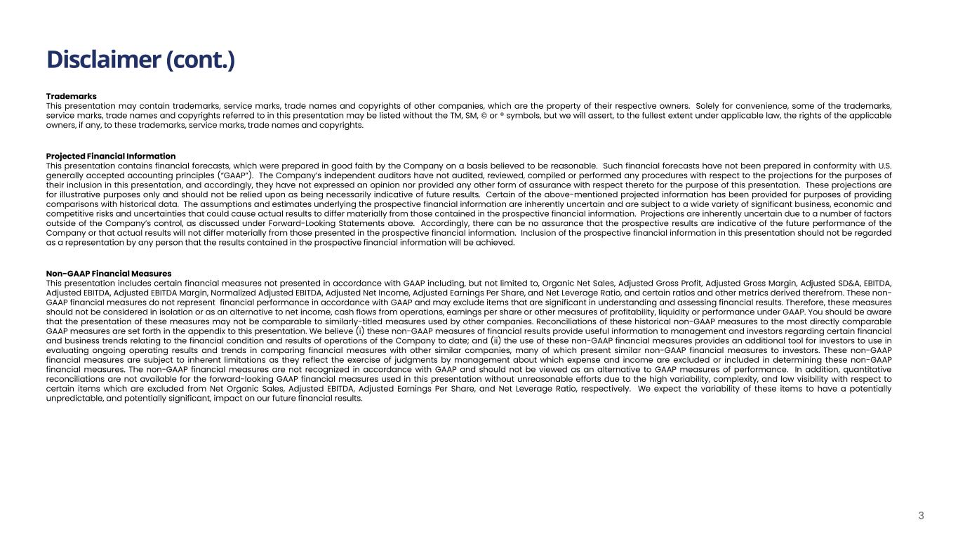 Disclaimer (cont.) 3 Trademarks This presentation may contain trademarks, service marks, trade names and copyrights of other companies, which are the property of their respective owners. Solely for convenience, some of the trademarks, service marks, trade names and copyrights referred to in this presentation may be listed without the TM, SM, © or ® symbols, but we will assert, to the fullest extent under applicable law, the rights of the applicable owners, if any, to these trademarks, service marks, trade names and copyrights. Projected Financial Information This presentation contains financial forecasts, which were prepared in good faith by the Company on a basis believed to be reasonable. Such financial forecasts have not been prepared in conformity with U.S. generally accepted accounting principles (“GAAP”). The Company’s independent auditors have not audited, reviewed, compiled or performed any procedures with respect to the projections for the purposes of their inclusion in this presentation, and accordingly, they have not expressed an opinion nor provided any other form of assurance with respect thereto for the purpose of this presentation. These projections are for illustrative purposes only and should not be relied upon as being necessarily indicative of future results. Certain of the above-mentioned projected information has been provided for purposes of providing comparisons with historical data. The assumptions and estimates underlying the prospective financial information are inherently uncertain and are subject to a wide variety of significant business, economic and competitive risks and uncertainties that could cause actual results to differ materially from those contained in the prospective financial information. Projections are inherently uncertain due to a number of factors outside of the Company’s control, as discussed under Forward-Looking Statements above. Accordingly, there can be no assurance that the prospective results are indicative of the future performance of the Company or that actual results will not differ materially from those presented in the prospective financial information. Inclusion of the prospective financial information in this presentation should not be regarded as a representation by any person that the results contained in the prospective financial information will be achieved. Non-GAAP Financial Measures This presentation includes certain financial measures not presented in accordance with GAAP including, but not limited to, Organic Net Sales, Adjusted Gross Profit, Adjusted Gross Margin, Adjusted SD&A, EBITDA, Adjusted EBITDA, Adjusted EBITDA Margin, Normalized Adjusted EBITDA, Adjusted Net Income, Adjusted Earnings Per Share, and Net Leverage Ratio, and certain ratios and other metrics derived therefrom. These non- GAAP financial measures do not represent financial performance in accordance with GAAP and may exclude items that are significant in understanding and assessing financial results. Therefore, these measures should not be considered in isolation or as an alternative to net income, cash flows from operations, earnings per share or other measures of profitability, liquidity or performance under GAAP. You should be aware that the presentation of these measures may not be comparable to similarly-titled measures used by other companies. Reconciliations of these historical non-GAAP measures to the most directly comparable GAAP measures are set forth in the appendix to this presentation. We believe (i) these non-GAAP measures of financial results provide useful information to management and investors regarding certain financial and business trends relating to the financial condition and results of operations of the Company to date; and (ii) the use of these non-GAAP financial measures provides an additional tool for investors to use in evaluating ongoing operating results and trends in comparing financial measures with other similar companies, many of which present similar non-GAAP financial measures to investors. These non-GAAP financial measures are subject to inherent limitations as they reflect the exercise of judgments by management about which expense and income are excluded or included in determining these non-GAAP financial measures. The non-GAAP financial measures are not recognized in accordance with GAAP and should not be viewed as an alternative to GAAP measures of performance. In addition, quantitative reconciliations are not available for the forward-looking GAAP financial measures used in this presentation without unreasonable efforts due to the high variability, complexity, and low visibility with respect to certain items which are excluded from Net Organic Sales, Adjusted EBITDA, Adjusted Earnings Per Share, and Net Leverage Ratio, respectively. We expect the variability of these items to have a potentially unpredictable, and potentially significant, impact on our future financial results.