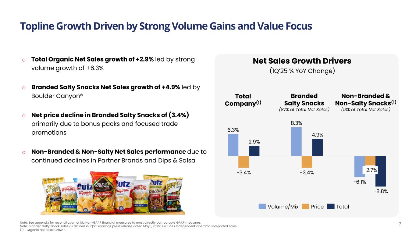 Top-line and Bottom-line Growth in 1Q’25 6 Adjusted EBITDA (in millions) $43 $45 1Q’24 1Q’25 Note: See appendix for reconciliation of Utz Non-GAAP financial measures to most directly comparable GAAP measures. Adjusted EPS $0.14 $0.16 1Q’24 1Q’25 +4% +14% Organic Net Sales (in millions) $342 1Q’24 1Q’25 $352 +3%