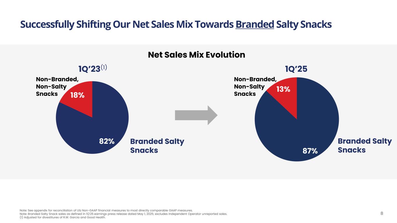 7Note: See appendix for reconciliation of Utz Non-GAAP financial measures to most directly comparable GAAP measures. Note: Branded Salty Snack sales as defined in 1Q’25 earnings press release dated May 1, 2025; excludes Independent Operator unreported sales. (1) Organic Net Sales Growth. Topline Growth Driven by Strong Volume Gains and Value Focus Branded Salty Snacks (87% of Total Net Sales) Non-Branded & Non-Salty Snacks(1) (13% of Total Net Sales) Total Company(1) 6.3% -3.4% 2.9% 8.3% -3.4% 4.9% -6.1% -2.7% -8.8% (1Q’25 % YoY Change) Volume/Mix Price Total Net Sales Growth Driverso Total Organic Net Sales growth of +2.9% led by strong volume growth of +6.3% o Branded Salty Snacks Net Sales growth of +4.9% led by Boulder Canyon® o Net price decline in Branded Salty Snacks of (3.4%) primarily due to bonus packs and focused trade promotions o Non-Branded & Non-Salty Net Sales performance due to continued declines in Partner Brands and Dips & Salsa
