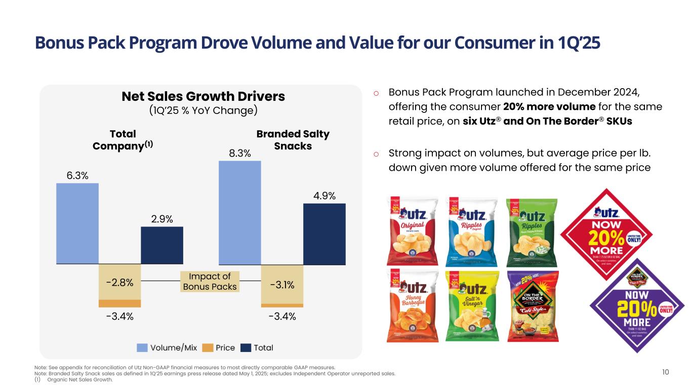 -3.1% 8.3% -3.4% 4.9% Bonus Pack Program Drove Volume and Value for our Consumer in 1Q’25 Branded Salty Snacks Total Company(1) Net Sales Growth Drivers Impact of Bonus Packs o Bonus Pack Program launched in December 2024, offering the consumer 20% more volume for the same retail price, on six Utz® and On The Border® SKUs o Strong impact on volumes, but average price per lb. down given more volume offered for the same price Note: See appendix for reconciliation of Utz Non-GAAP financial measures to most directly comparable GAAP measures. Note: Branded Salty Snack sales as defined in 1Q’25 earnings press release dated May 1, 2025; excludes Independent Operator unreported sales. (1) Organic Net Sales Growth. -2.8% 6.3% -3.4% 2.9% (1Q’25 % YoY Change) 10