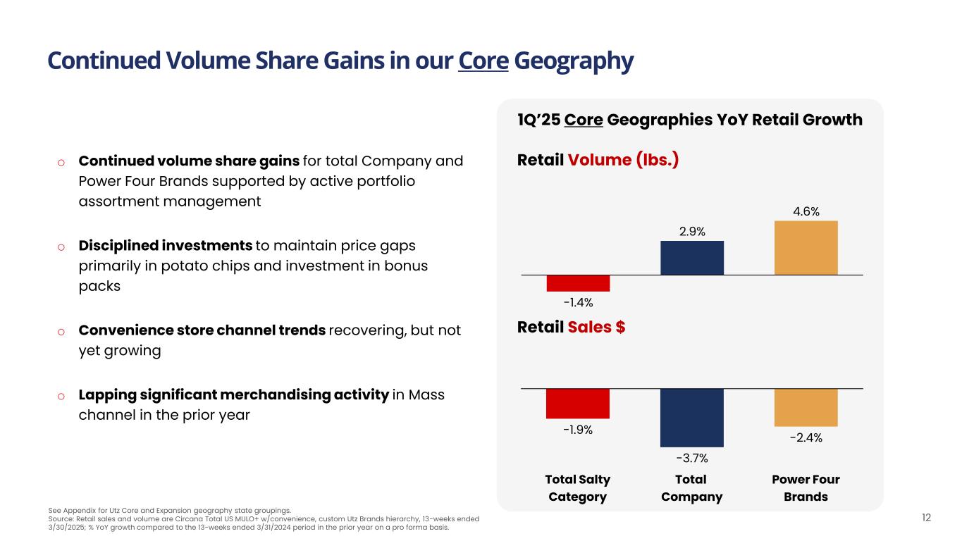 Our Power Four Brands Continued to Gain Share in 1Q’25 11 1Q’25 MULO+ w/Convenience YoY Growth -1.6% 5.7% 7.5% Retail Volume (lbs.) Total Salty Category Total Company Power Four Brands -1.7% 0.0% 1.7% Retail Sales $ -3.0% -3.5%-0.1% -5.4% -5.4% Retail Price/lb. Source: Retail sales and volume are Circana Total US MULO+ w/convenience, custom Utz Brands hierarchy, 13-weeks ended 3/30/25; % YoY growth compared to the 13-weeks ended 3/31/2024 period in the prior year on a pro forma basis. (1) Measured using MULO+ w/Convenience and Company 1Q’25 internal Net Sales data. o Dollar and volume share gains for total Company and Power Four Brands, led by Boulder Canyon® o Growth led by Expansion geographies driven by distribution gains and higher velocities o Retail price per pound declined primarily due to bonus packs, channel mix, and disciplined promotional spend Impact of bonus packs(1)