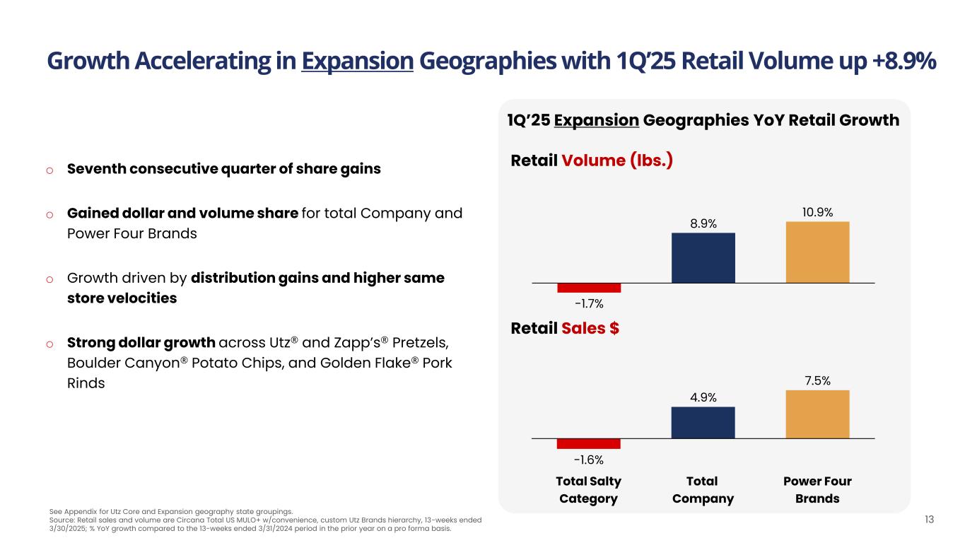 1Q’25 Core Geographies YoY Retail Growth Retail Volume (lbs.) See Appendix for Utz Core and Expansion geography state groupings. Source: Retail sales and volume are Circana Total US MULO+ w/convenience, custom Utz Brands hierarchy, 13-weeks ended 3/30/2025; % YoY growth compared to the 13-weeks ended 3/31/2024 period in the prior year on a pro forma basis. Continued Volume Share Gains in our Core Geography 12 Total Salty Category Total Company Power Four Brands -1.9% -3.7% -2.4% -1.4% 2.9% 4.6% Retail Sales $ o Continued volume share gains for total Company and Power Four Brands supported by active portfolio assortment management o Disciplined investments to maintain price gaps primarily in potato chips and investment in bonus packs o Convenience store channel trends recovering, but not yet growing o Lapping significant merchandising activity in Mass channel in the prior year